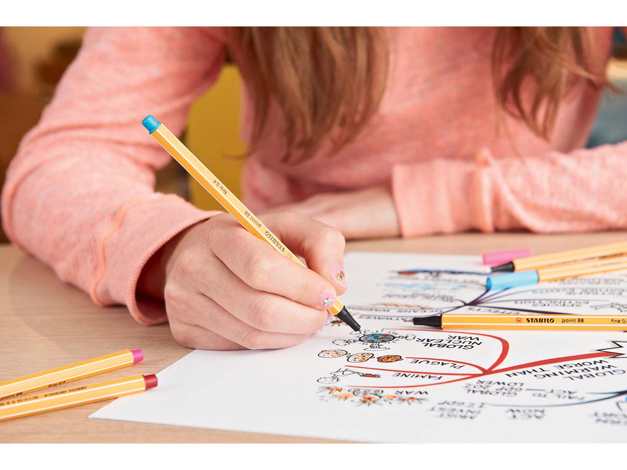 Die vielseitigen Fineliner im praktischen 6er-Set bieten Präzision und Zuverlässigkeit für Schule, Studium und Beruf. Sie eignen sich ideal für Notizen, Skizzen und Zeichnungen. Die metallgefasste Spitze ermöglicht exaktes Arbeiten und ist perfekt für den Einsatz mit Lineal und Schablone. Die Kappe lässt sich einfach am Stiftende befestigen, um komfortables Schreiben oder Zeichnen zu gewährleisten. Ein hoher Austrocknungsschutz sorgt dafür, dass der Stift auch ohne Kappe einsatzbereit bleibt. Ein funktionaler Klassiker, der kreative und organisatorische Aufgaben effizient unterstützt. 96 % biobasierter Kunststoff wird für die Herstellung des Gehäuses verwendet (Massenbilanz). Erhältlich in verschiedenen Farben.Mit einer Strichstärke von 0,4 mm. Inhalt 6 Stk., farbig sortiert.