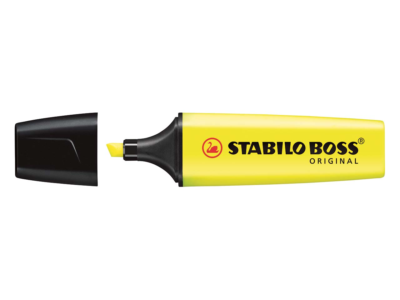 Die in Deutschland hergestellten Textmarker "BOSS ORIGINAL" markieren in leuchtenden Neonfarben und heben Textstellen auf allen gängigen Papiersorten gut sichtbar hervor. Das Stiftgehäuse aus stabilem Kunststoff in Schriftfarbe rollt dank seiner markanten Form nicht vom Tisch. Die Tinte ist auf Wasserbasis hergestellt und geruchsarm. Die STABILO Austrockenschutz-Technologie schützt vor schnellem Austrocknen: Bis zu vier Stunden kann der Leuchtstift offen liegen. Über die Spitze kann der Textmarker durch die praktischen Aufstecktanks einfach nachgefüllt werden. Die schräge Stiftspitze schreibt in der Strichbreite 2-5 mm.