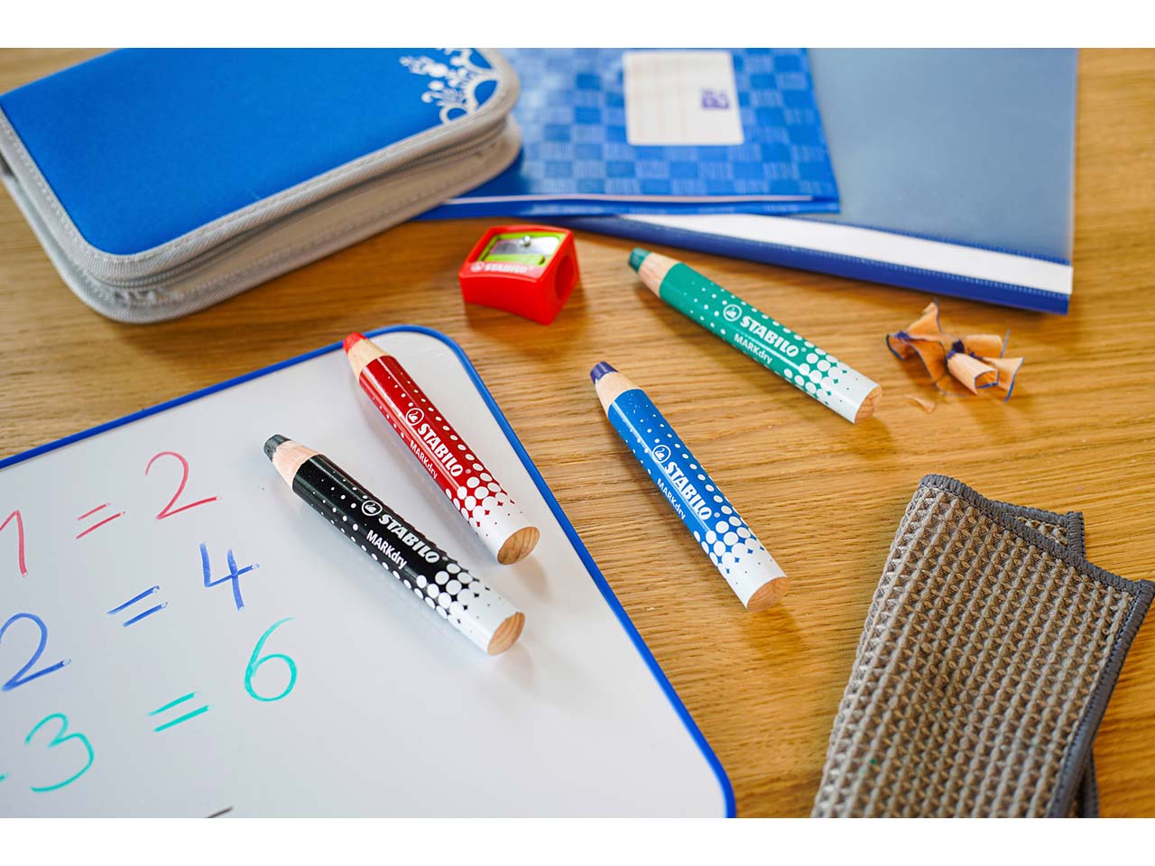 Für große und kleine Kinder, für Schule und für Kindergärten: Die Trockenmarker von STABILO sind Buntstifte mit spezieller Mine für Whiteboards und Flipcharts. Die Marker aus PEFC-zertifiziertem Holz haben eine robuste XXL-Mine mit sattem Abstrich und können von glatten Oberflächen trocken oder nass abgewischt werden. Die Trockenmarker sind jederzeit einsatzbereit, trocknen nicht aus und überzeugen mit Farbintensität bis zum letzten Strich. Im praktischen Set mit 4 Stiften in Rot, Grün, Blau und Schwarz, Spitzer und Abwischtuch.