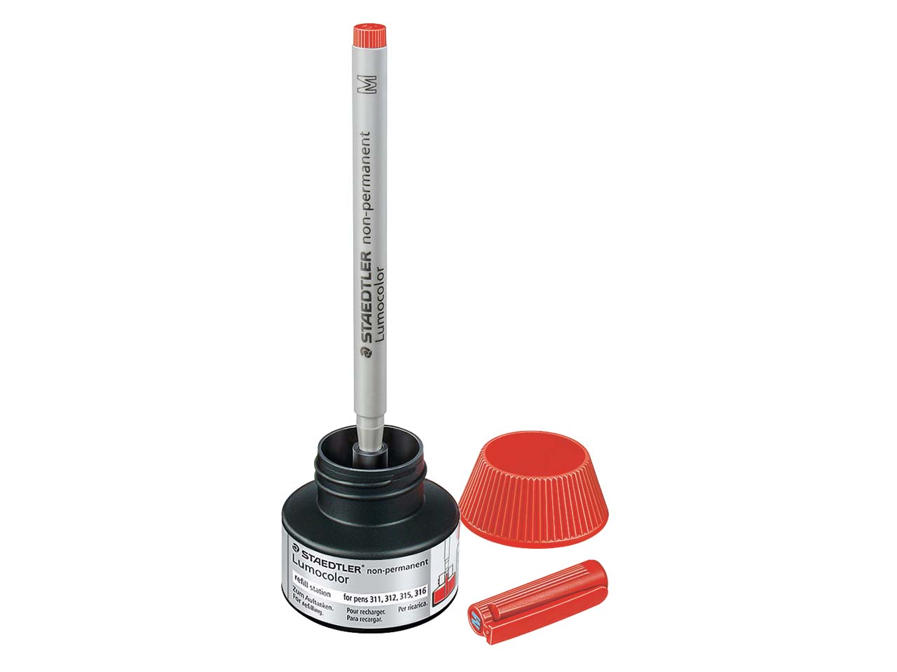 Die Refillstation für die STAEDTLER Universal-Marker "Lumocolor" funktioniert ganz einfach: Der Marker muss nur in die Station eingesetzt werden und ist nach Minuten wieder schreibbereit. Volle Nachfüllung nach 3 bis 4 Stunden. 1 Flasche = 15 ml. Farbe rot.