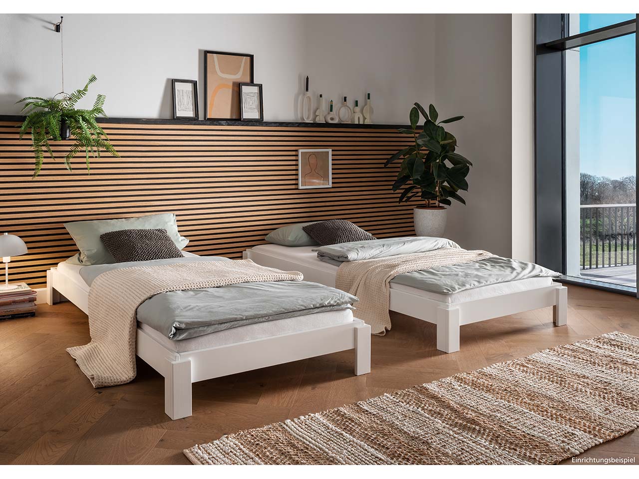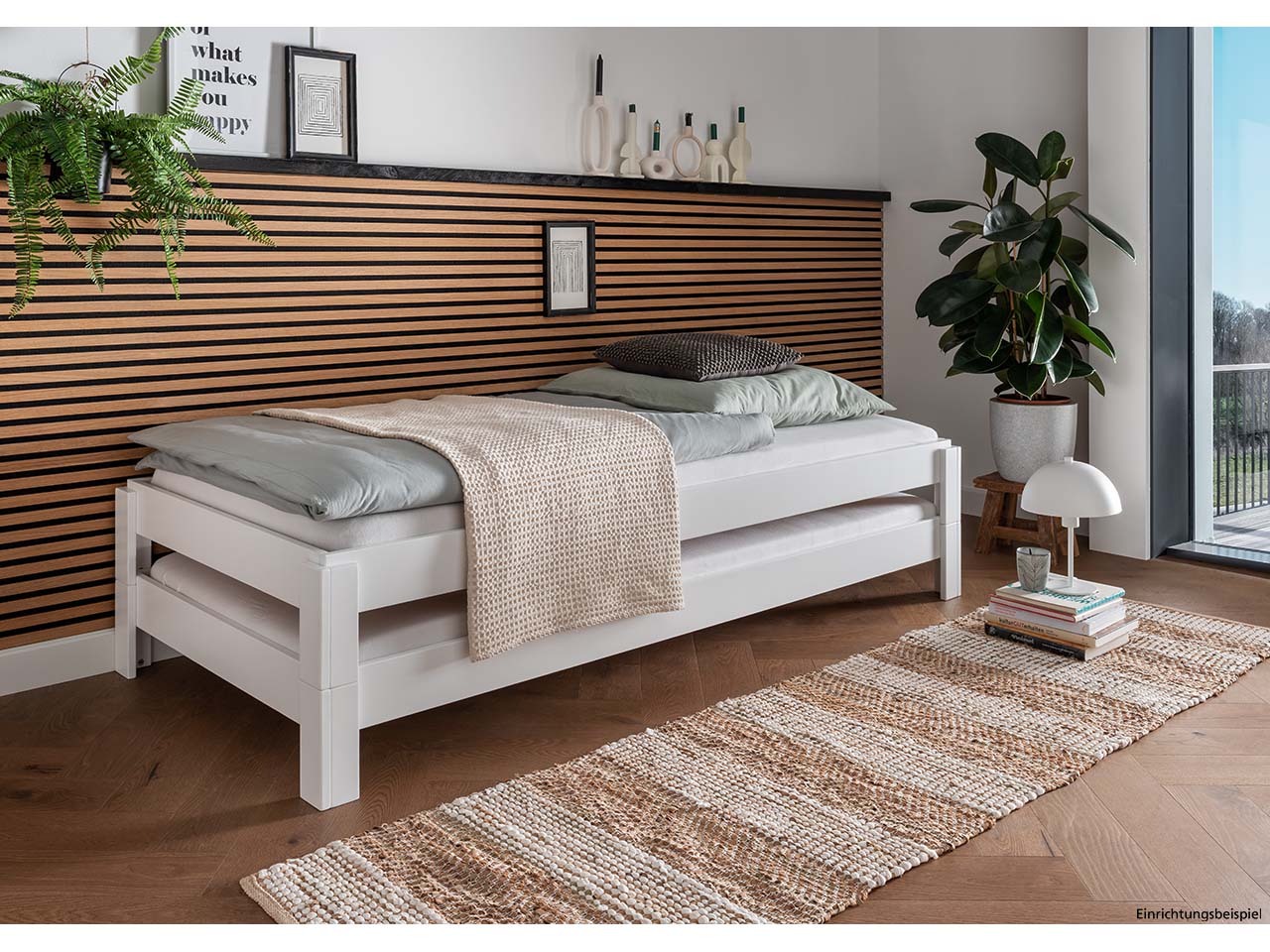 Auf den ersten Blick sieht dieses Gestell wie ein wunderschönes, normales Bett aus. Doch es hat eine Besonderheit: es kann gestapelt werden! Wird also ein zweites Bett dazugekauft, entsteht eine einzigartige Komforthöhe, die beim Aufstehen oder Hinlegen hilfreich ist. Oder die Betten werden zu einem Doppelbett nebeneinandergestellt. Ein einziges Bett und so viele Möglichkeiten! Das Stapelbett ist ideal für Kinder- und Gästezimmer, da es sich den Gegebenheiten immer wieder neu anpassen lässt. Durch die Herstellung aus massivem Buchenholz punktet das Bettgestell zusätzlich mit robuster, langlebiger Qualität. Das Gestell ist so verarbeitet, dass es optimal ineinandergreift mit einem zweiten Bettgestell. Stabilität ist so auch gegeben, wenn die Gestelle übereinander liegen.
