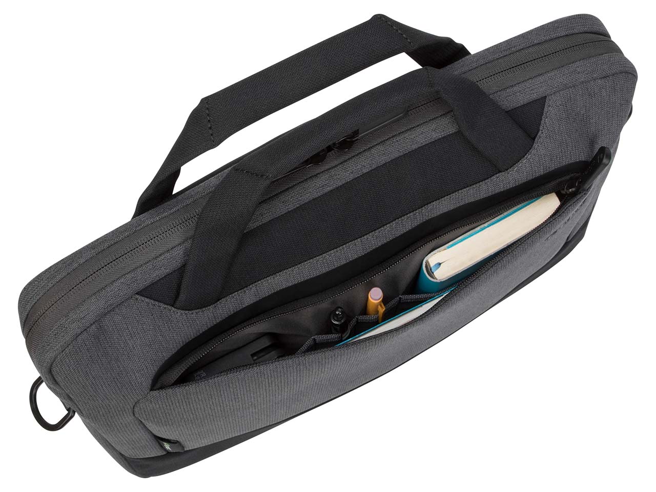 Diese leichte, schlanke Laptoptasche ist der perfekte Begleiter auf dem Weg zur Arbeit, zur Schule, zur Uni oder auf Reisen. Geräte bis 14" lassen sich gut geschützt in der Tasche aufbewahren. Das Material ist umweltverträglich aus 48 % Post-Consumer-Recycling-Material hergestellt: 12 recycelte Kunststoff-Wasserflaschen erhalten ein neues Leben und landen nicht in Wasserstraßen oder auf Deponien. Die Notebooktasche verfügt über ein Hauptfach sowie ein Fach für schnellen Zugriff. Bequemer Transport ist durch die drei flexiblen Trageweisen gewährleistet: per Tragegriff, Schultergurt oder per Trolley-Gurt zur Befestigung am Rollkoffer. Dabei ist die Laptoptasche modern designt und macht Tag für Tag eine exzellente Figur. Maße B 38 x T 4 x H 32,5 cm.