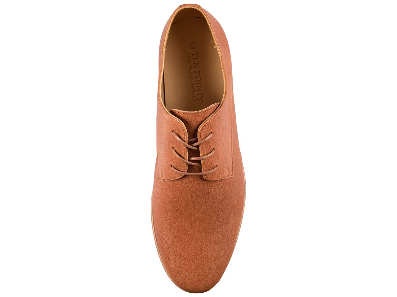 Diese Schuhe von Ten Points werden wie alle Schuhe des Unternehmens in Schweden entworfen. Die Fertigung von Hand erfolgt in Portugal. Dabei werden nachhaltige Produktionsmethoden und Geschäftspraktiken verfolgt. Zum Beispiel wird das Leder nicht aus außereuropäischen Ländern importiert. Zusätzlich widmet sich Ten Points der slow fashion: Das langlebige Schuhwerk kann und soll länger als eine Saison getragen werden.