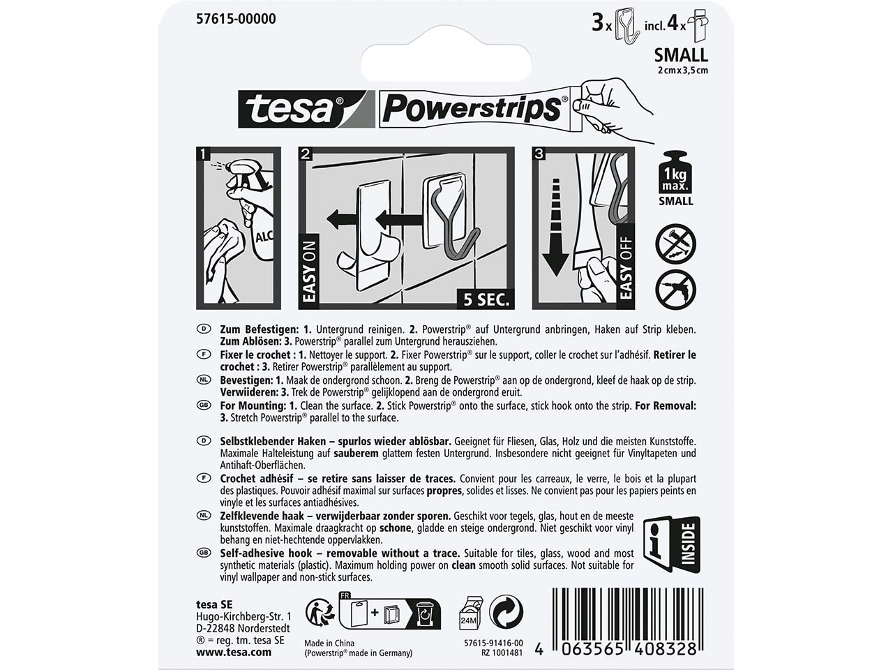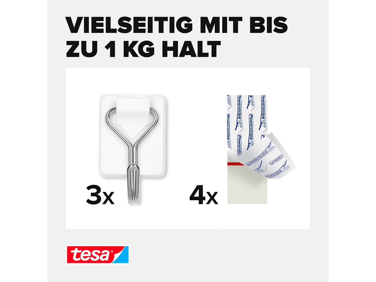 Der selbstklebende Haken von tesa ist vielseitig einsetzbar – ob als Dekohaken, Handtuchhalter im Bad oder in der Küche für Utensilien. Dank Powerstrip lässt er sich mühelos und ohne Werkzeug anbringen, ganz ohne Spuren an Wänden oder Fliesen zu hinterlassen. Durch die Kombination aus Kunststoffhaken und abnehmbarem Metallhaken ist er besonders flexibel einsetzbar. Das Beste: Mit einem neuen Powerstrip kann der Haken jederzeit wiederverwendet werden! Für Gegenstände bis 1 kg geeignet. Inhalt 3 Stk.