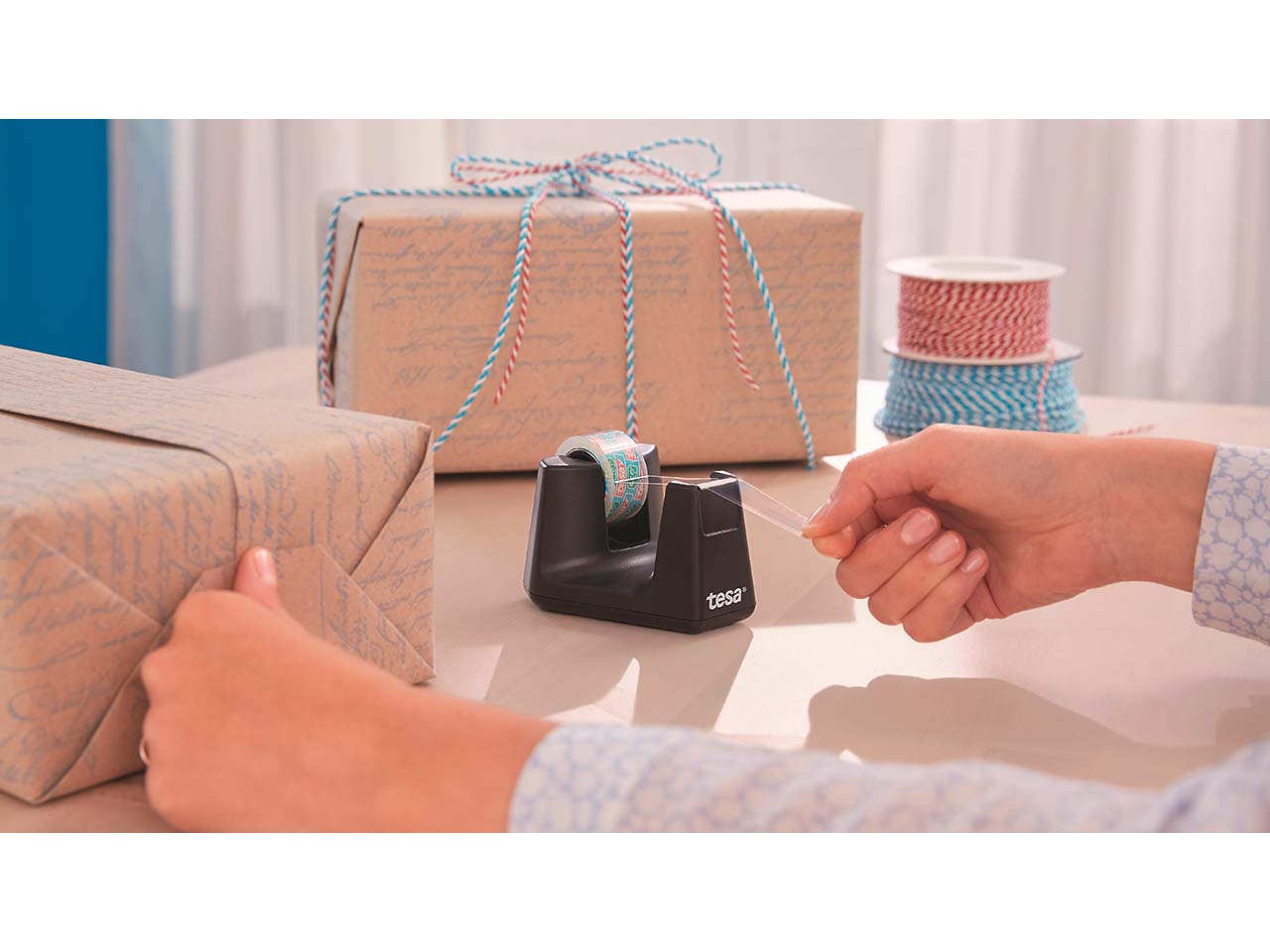 Das Gehäuse des tesa Tischabrollers besteht zu 100 % aus Recycling-Kunststoff. Bei den Klebebändern sind Trägerfolie und Rollenkern aus recyceltem Kunststoff hergestellt. Verpackung aus 80 % recyceltem Karton. PVC-frei.
