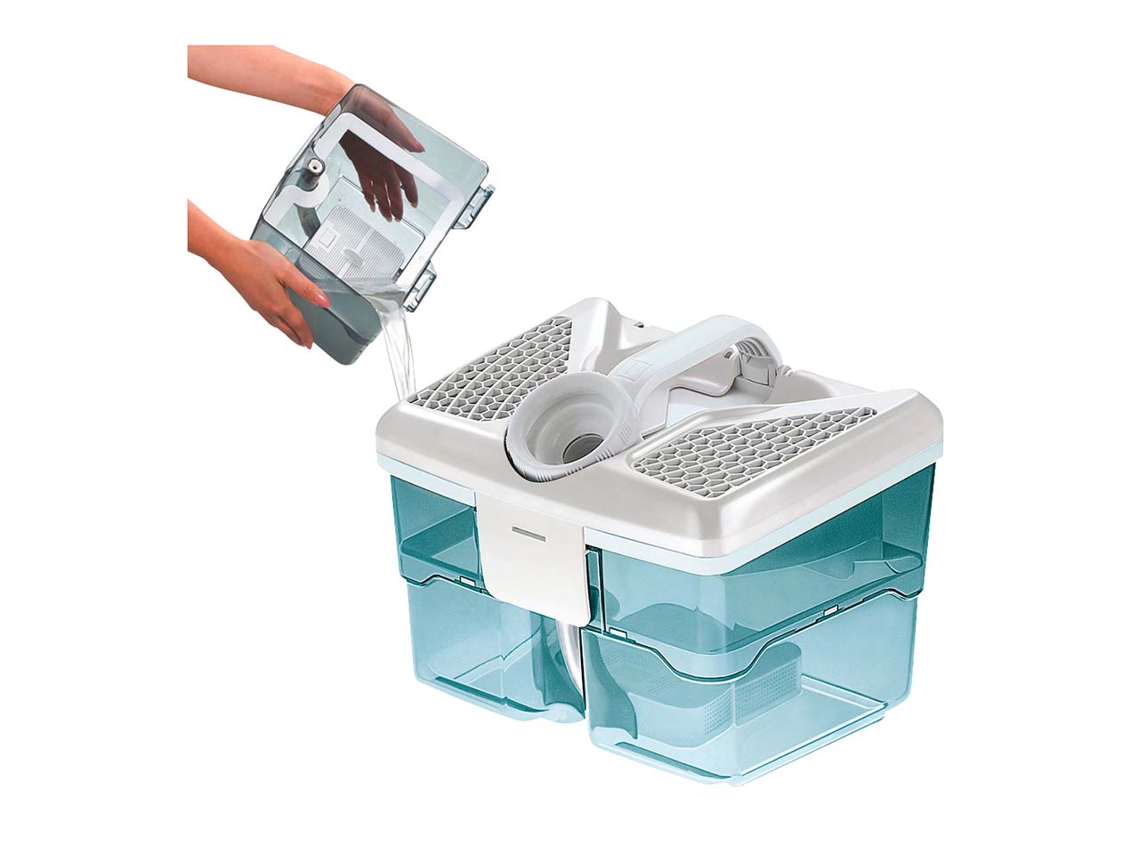 Die Wasserfilterbox eignet sich perfekt für den Großputz. Dreck und Schmutz werden im Wasser gebunden. Der Wasserfilter bindet unangenehme Gerüche und wirkt gleichzeitig auch wie ein Lufterfrischer. Selbst Feuchtigkeit kann so aufgesaugt werden. Die Filterkassette wird nach jeder Reinigung einfach in der Toilette entleert.