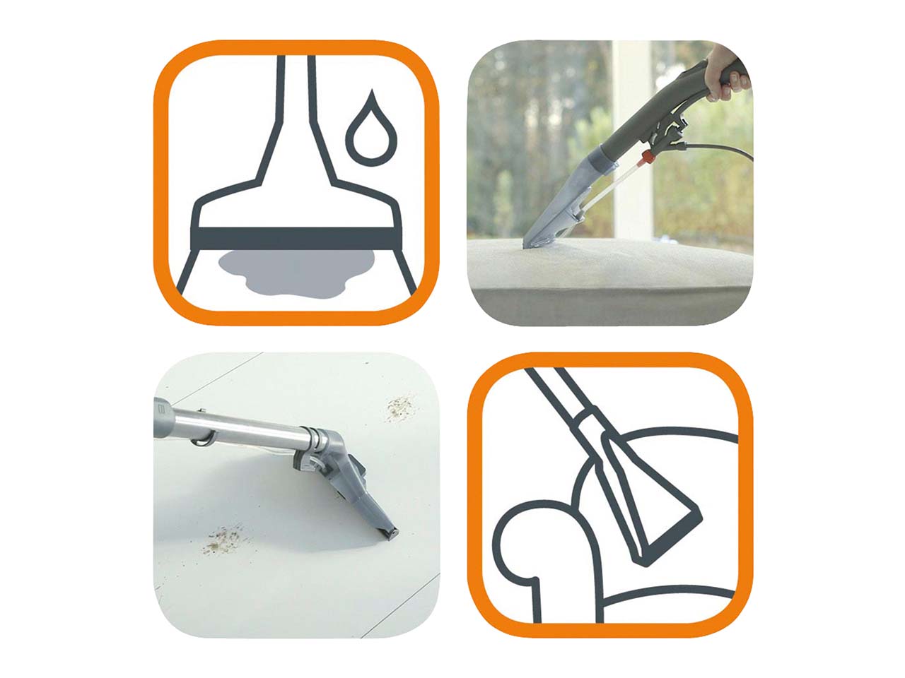 Eine Besonderheit ist das Waschsaugen: Hier kommt die Druckpumpe (4 bar) zum Einsatz, die ein Reinigungsmittel aus dem integrierten Vorratstank (3,6 l) direkt auf z.B. Polster oder Autositze sprüht. Die Wasch-Saugdüse saugt das Reinigungsmittel sofort wieder ab. So ist es möglich, Polster und Teppiche wie bei einem Profiaufbereiter regelrecht zu waschen. Glatte Böden können auf die gleiche Weise gleichzeitig gesaugt und gewischt werden.