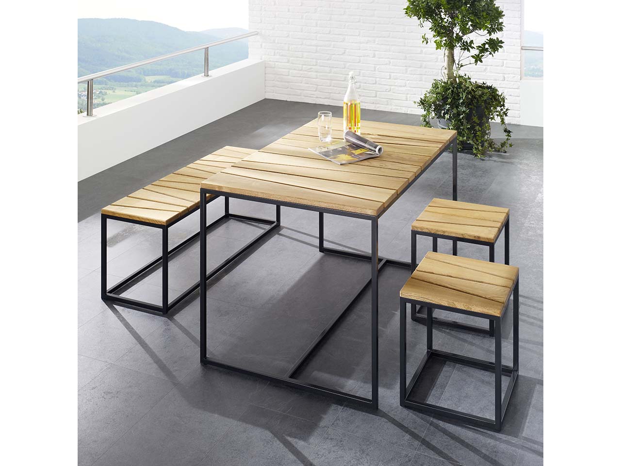 Eine Sitzgruppe für Garten und Terrasse, die sich neben Funktionalität auch durch das Design hervorhebt, das ist die Tischgruppe "Alois". Das hochwertig verarbeitete Set bestehend aus einem Tisch, zwei Hockern und einer Bank zeichnet sich durch langlebige Qualität aus. Optisch hat die Tischgruppe ebenfalls viel zu bieten: Das Untergestell ist aus stabilem, langlebigem Stahl gefertigt, Sitzflächen und Tischplatte bestehen aus Holz. Dieses wirkt mit der versetzt trapezförmig verjüngenden Lattung sehr modern.