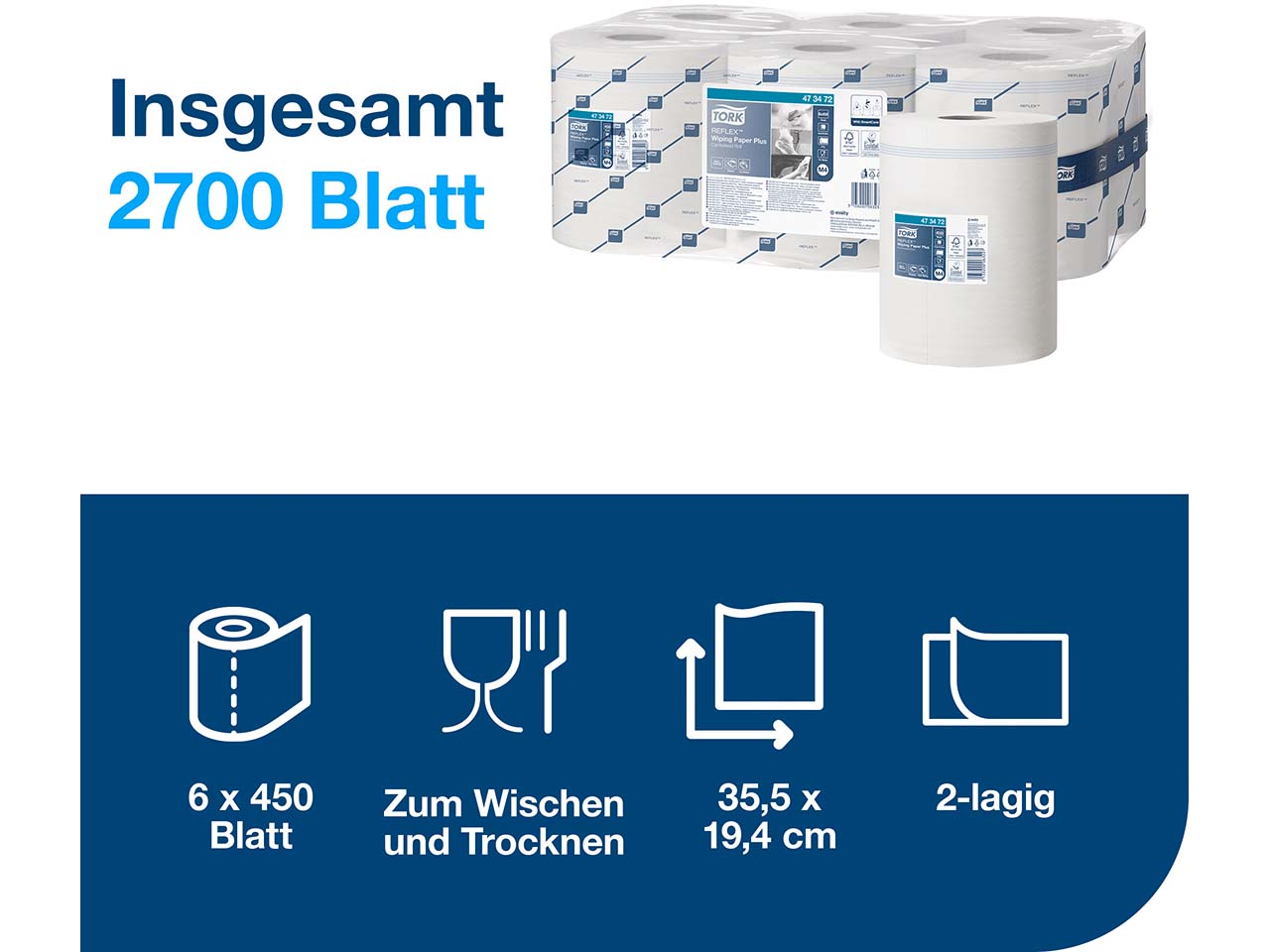 Mit ihren zwei Lagen sind diese Mehrzweck-Papierwischtücher aus Recyclingfasern für alle Wischarbeiten und das Händetrocknen geeignet. Die Tücher haben eine exzellente Aufnahmefähigkeit und sind so ideal, um Flüssigkeiten aufzuwischen. Die nach FSC und EU Ecolabel zertifizierten Papierwischtücher eignen sich für Tork Reflex Innenabrollungsspendern. Die herausnehmbare Hülse ermöglicht ein einfaches Nachfüllen.