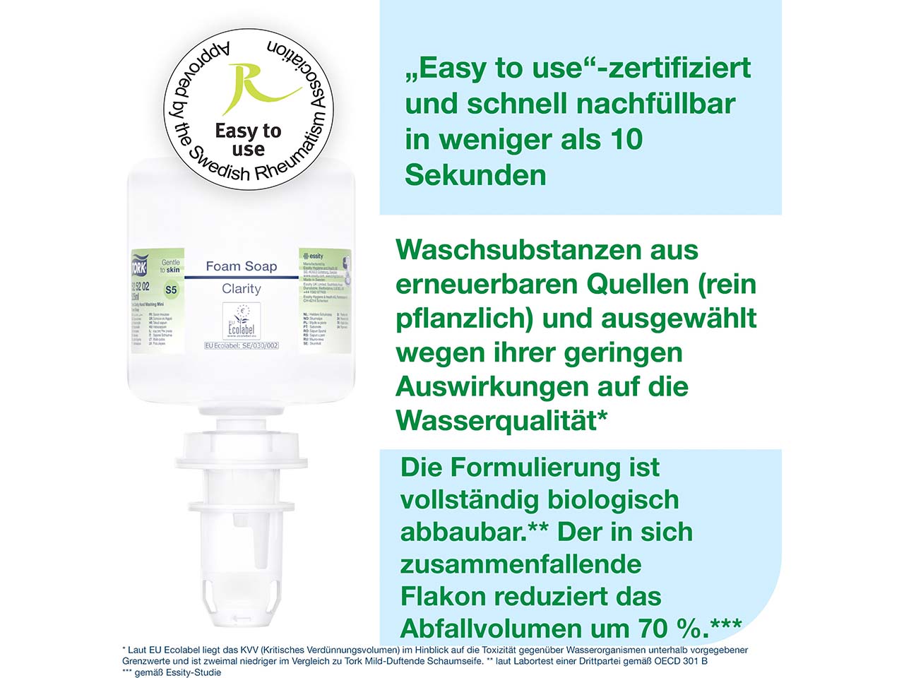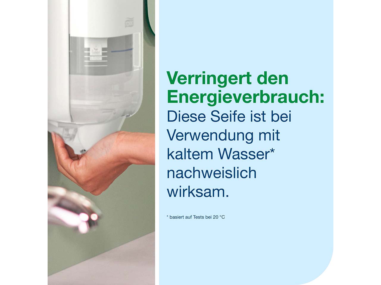 Diese Schaumseife mit Waschsubstanzen aus rein pflanzlichen Quellen ist speziell für den Tork „Elevation S5“ entwickelt. Sie ist eine exzellente Wahl, um sich in Waschräumen die Hände zu waschen – auch mit kaltem Wasser. Das Auf- bzw. Nachfüllen gestaltet sich einfach und in weniger als 10 Sekunden.