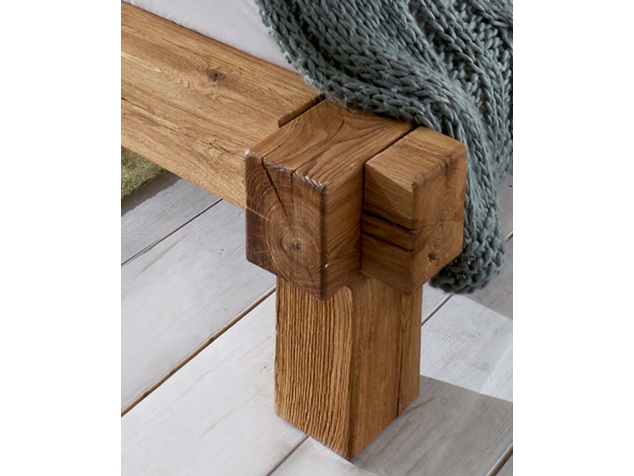 Das Massivholzbett wirkt besonders natürlich und ursprünglich. Dazu trägt neben dem attraktiven und immer einzigartig gemaserten Holz auch das Design bei. Die kräftigen, ineinander verbundenen Balken vermitteln Ruhe und Beständigkeit. Dabei bleibt die Optik stets minimalistisch und zeitlos, sodass das Bett viele Jahre Freude bereitet. Das passende Kopfteil ist perfekt, um sich auch mal hinzusetzen, um zu lesen oder zu entspannen.