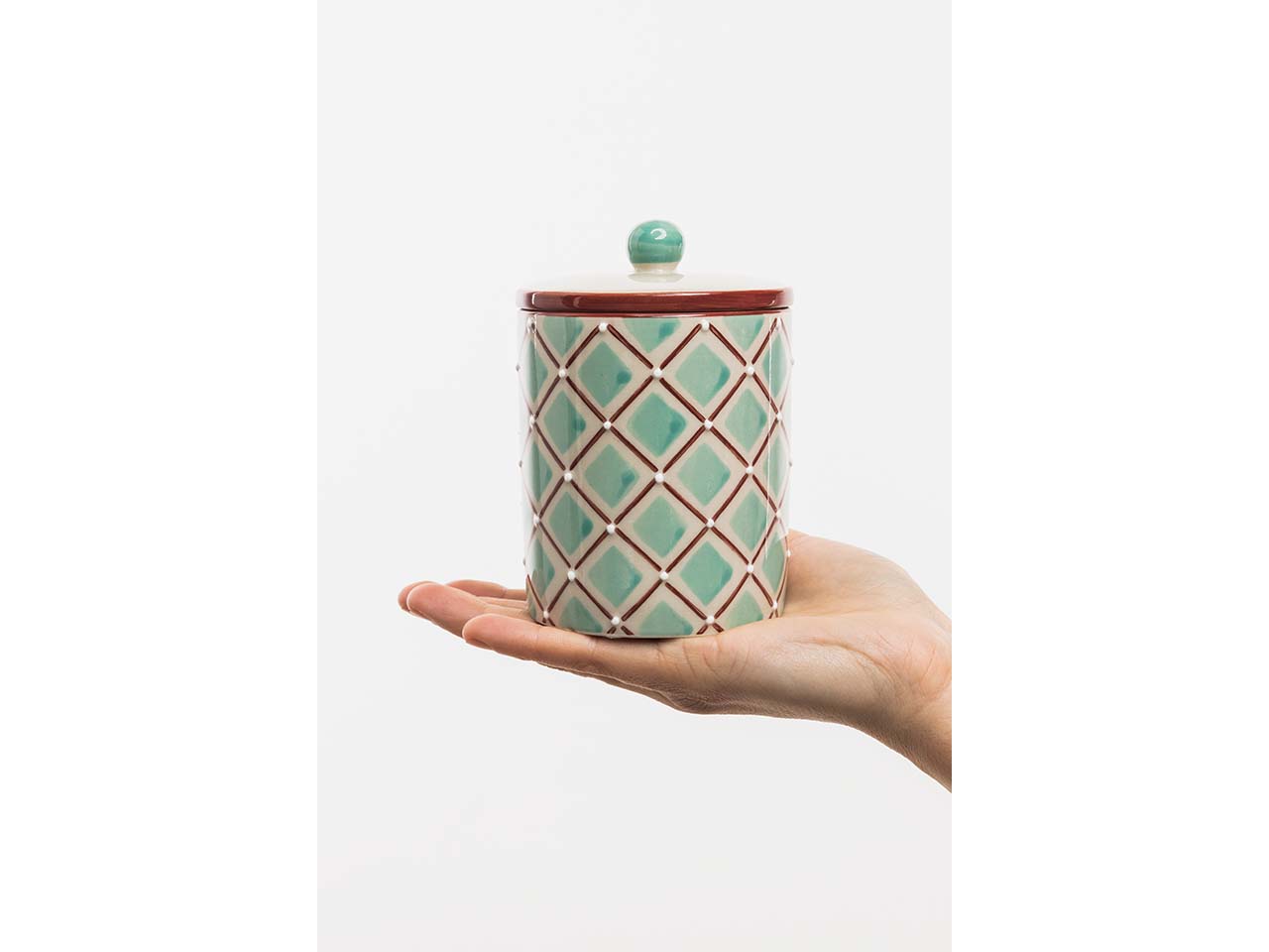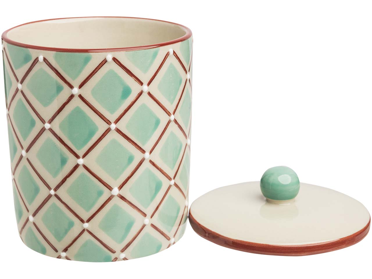 Eine Aufbewahrungsdose mit Retro-Charme! Die Steingutdose ist ein echtes Dekorationshighlight in Küche oder Bad. Sie ist ideal für die Aufbewahrung von Tee, Kaffee, Zucker oder anderen trockenen Lebensmitteln. Die Dose kann auch z.B. für Schmuck, Watte und vieles mehr verwendet werden. Die Dose ist mit Deckel ausgestattet, der den Inhalt schützt. Das elegante Retro-Design ist handgestempelt.