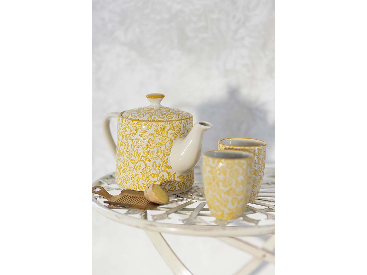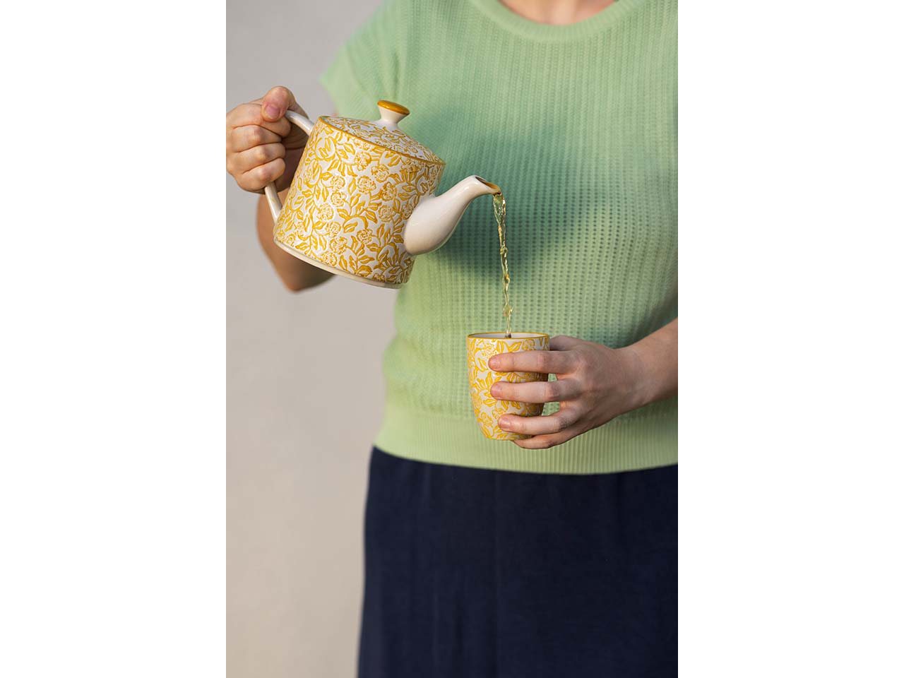 Filigranes, handgestempeltes Design, das zu gemütlichen, entspannenden Momenten einlädt. Ob Tee oder Kaffee, aus diesem Steingutbecher schmeckt jedes Heißgetränk. Der Becher ist passend zur gleichnamigen Teekanne gehalten, lässt sich aber auch wunderbar mit verschiedenen Stilen kombinieren. Der Becher hat ein Fassungsvermögen von 150 ml und kann in der Spülmaschine gereinigt werden. B 7 x T 7 x H 9 cm.