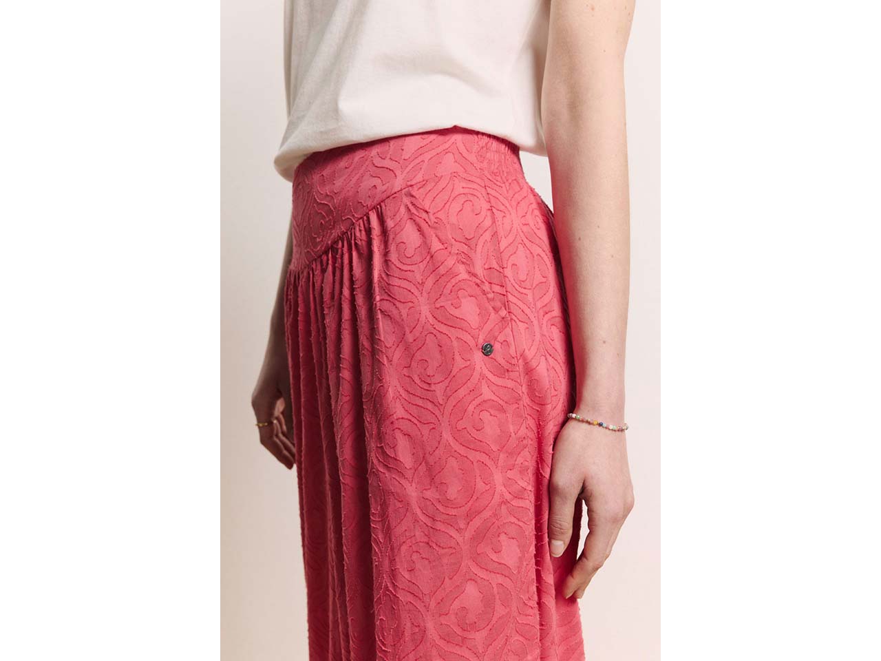 Das dezente Muster und die so entstehende Batist-Optik machen diese Culotte von tranquillo zu einem besonders stylischen Teil. Die Hose mit elastischem Bund besteht zu 100 % aus GOTS-zertifizierter Bio-Baumwolle, wodurch sie sich besonders weich auf der Haut anfühlt. Die Culotte ist ideal, um sie mit Blusen oder T-Shirts zu kombinieren. Seitliche Taschen hat die Hose auch.