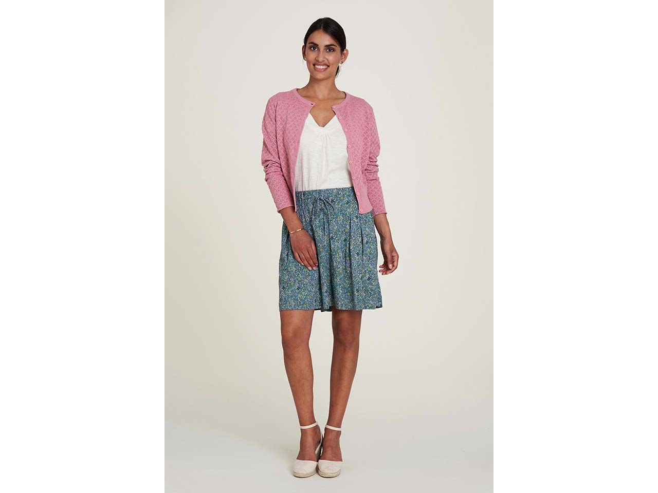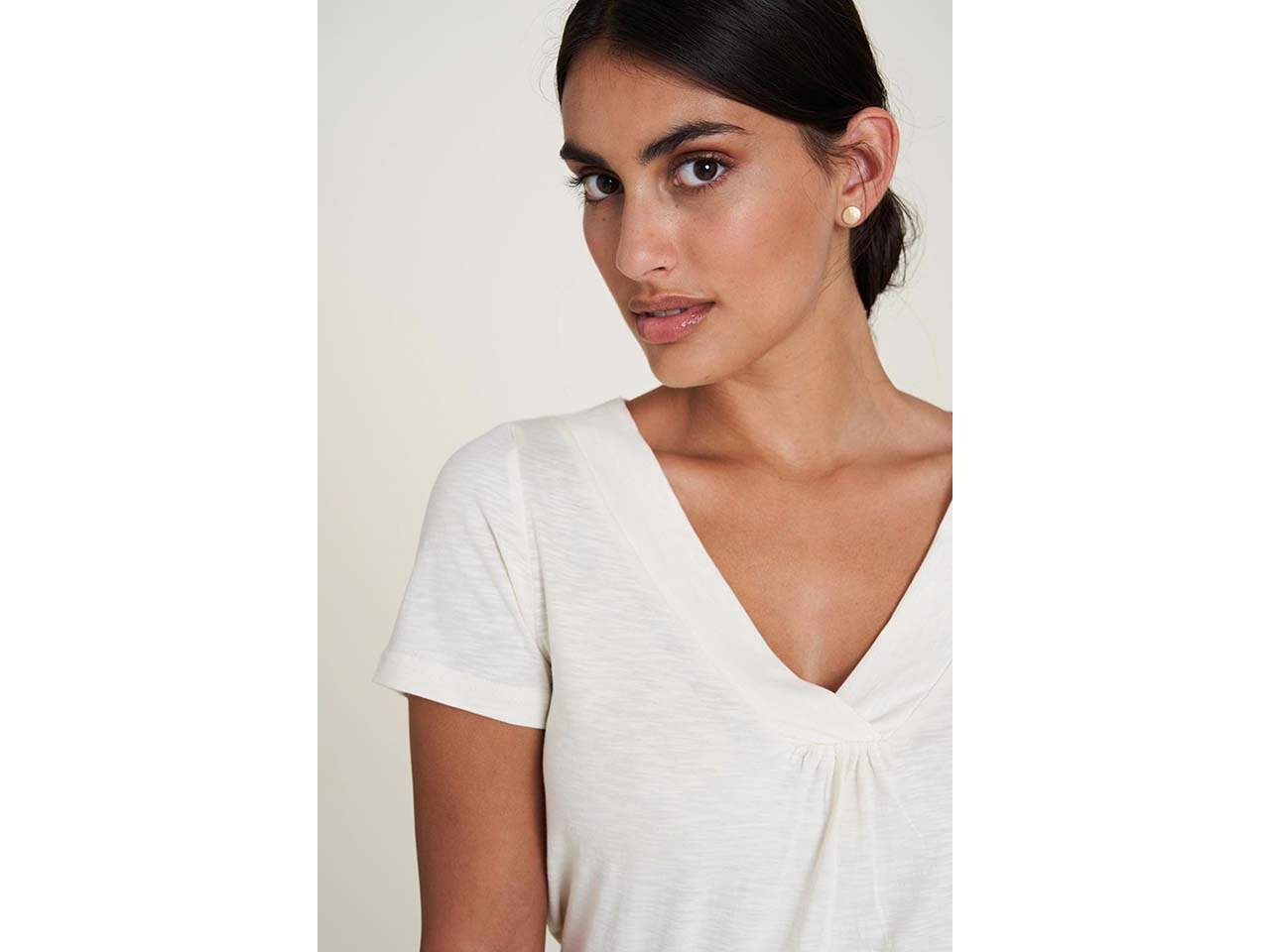 Ein wunderschönes T-Shirt, das Damen Frühjahr und Sommer versüßt! Zarte Webelemente im Stoff, V-Ausschnitt mit breiter Blende und hoher Tragekomfort zeichnen das Oberteil aus. Dabei fühlt es sich auch wunderbar weich an, denn es ist zu 100 % aus GOTS-zertifizierter Bio-Baumwolle gefertigt. Das Slub-Jersey-Shirt passt zu verschiedenen Outfits und lässt sich mit Jeans oder Rock kombinieren.