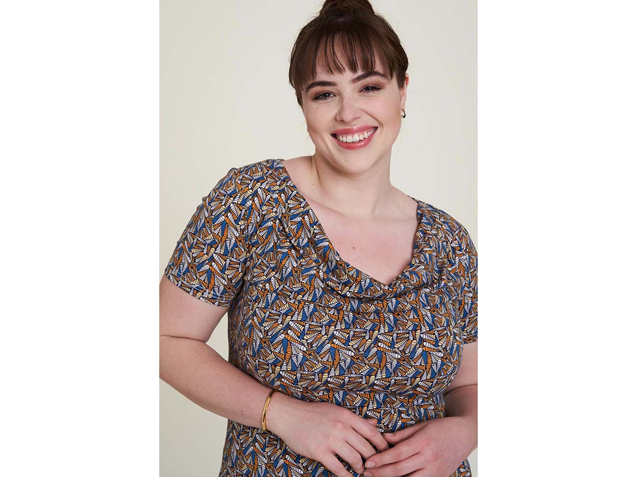 Hier treffen hoher Tragekomfort und modischer Ausdruck aufeinander! Das T-Shirt aus weichem Stretch-Jersey aus GOTS-zertifizierter Bio-Baumwolle und einem kleinen Anteil Elasthan fühlt sich wunderbar auf der Haut an, sodass man das Oberteil den ganzen Tag tragen kann. Das Shirt hat mit seiner schlichten Eleganz, dem figurbetonten Schnitt und dem All-Over-Print das Zeug dazu, zum neuen Lieblingsteil zu werden! Der Wasserfallausschnitt gibt dem Oberteil seinen besonderen Look und ist kombinierfreudig: Das Shirt sieht zur Jeans genauso cool aus wie zum Rock.