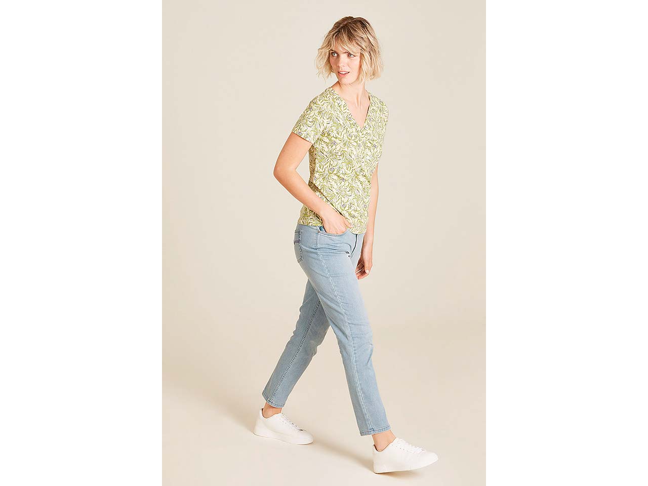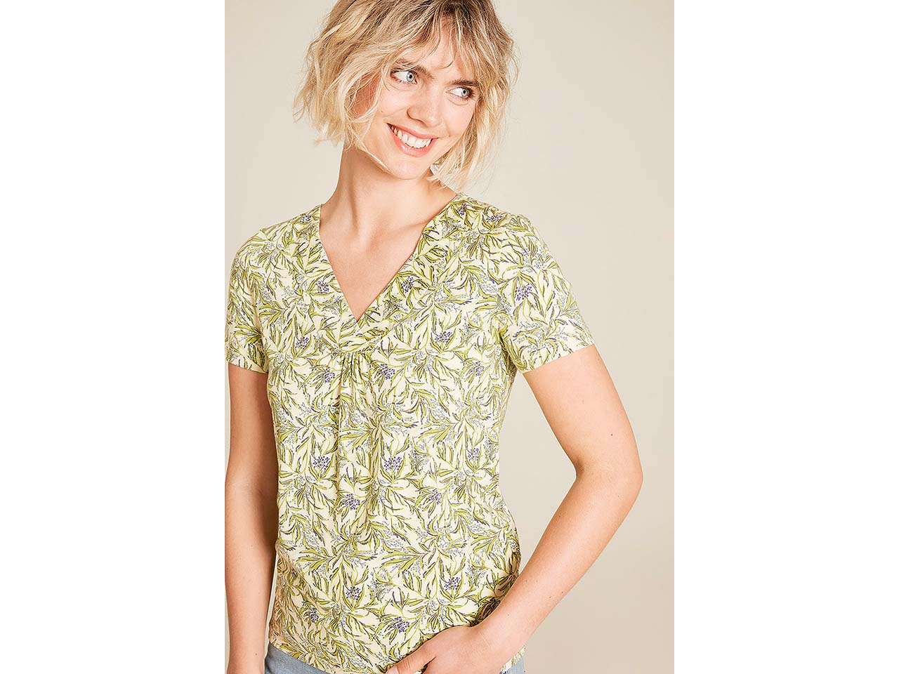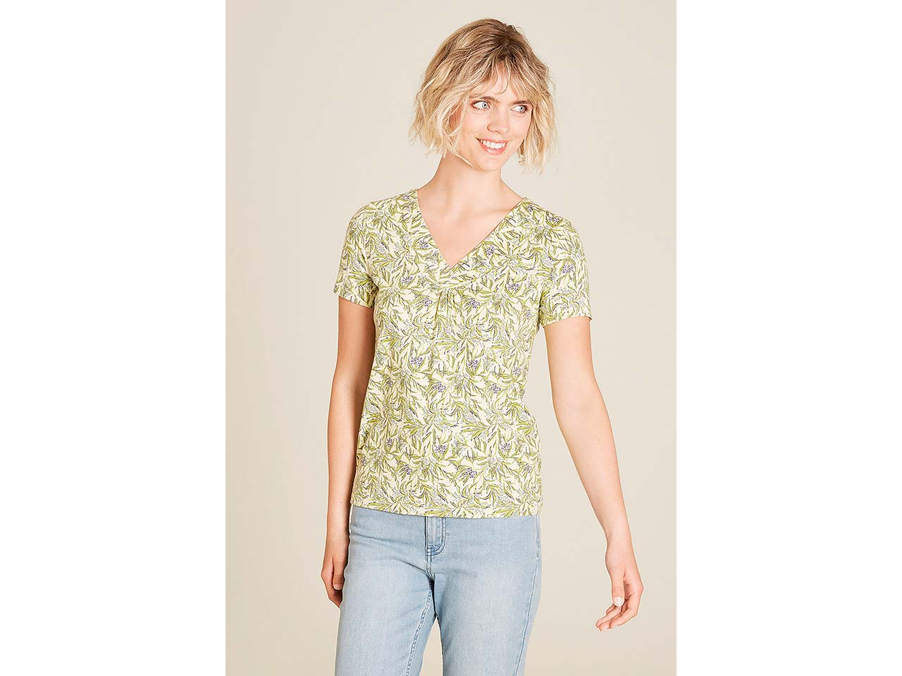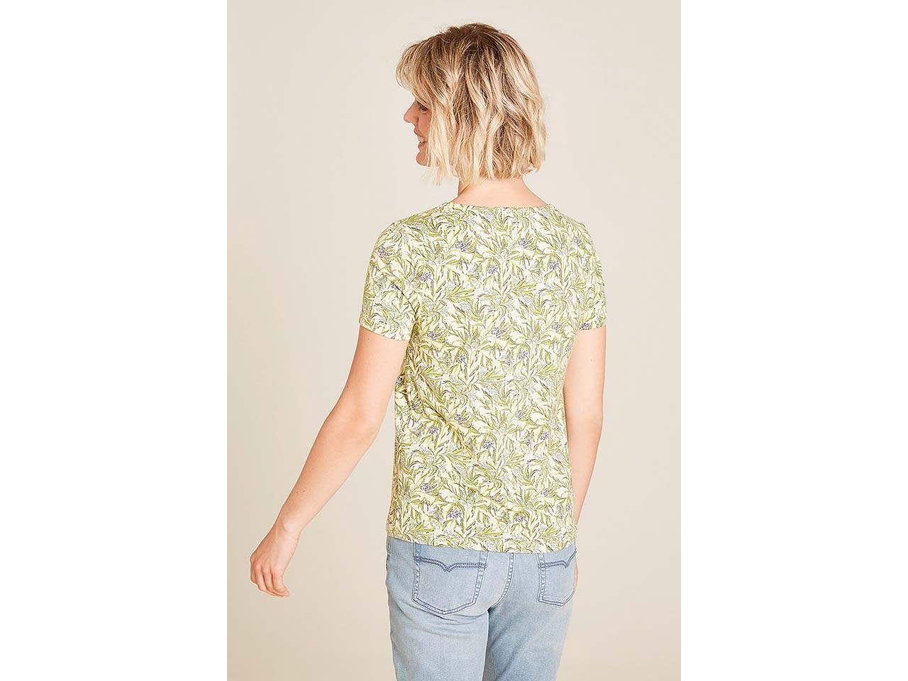 Dieses T-Shirt begleitet Damen durch viele Sommer! Der stretchige Jerseystoff aus GOTS-zertifizierter Bio-Baumwolle und einem geringen Anteil Elasthan sorgt für einen besonders hohen Tragekomfort. Das gerade geschnittene Shirt mit abgesetztem V-Ausschnitt und All-Over-Print vermittelt einen Hauch von moderner Eleganz – ideal, um es vielseitig zu kombinieren.