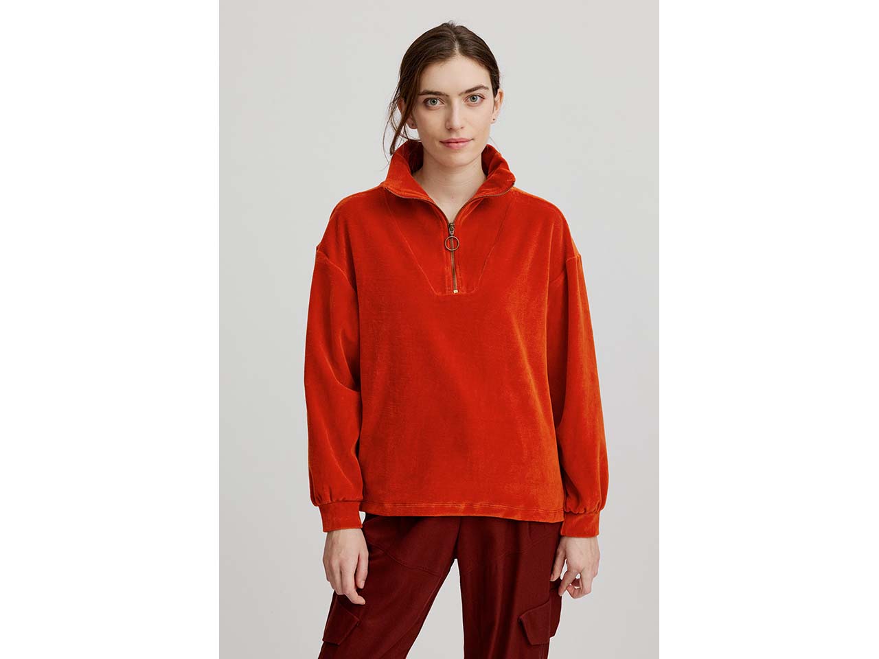 Dieser Troyer ist die perfekte Wahl für kühle Tage in Herbst und Winter! Das samtig-weiche Nicky-Velours-Material fühlt sich kuschelig an und hält warm. Der GOTS-zertifizierte Pullover mit Half-Zip hat eine reguläre Passform und eignet sich für vielseitige Outfits.