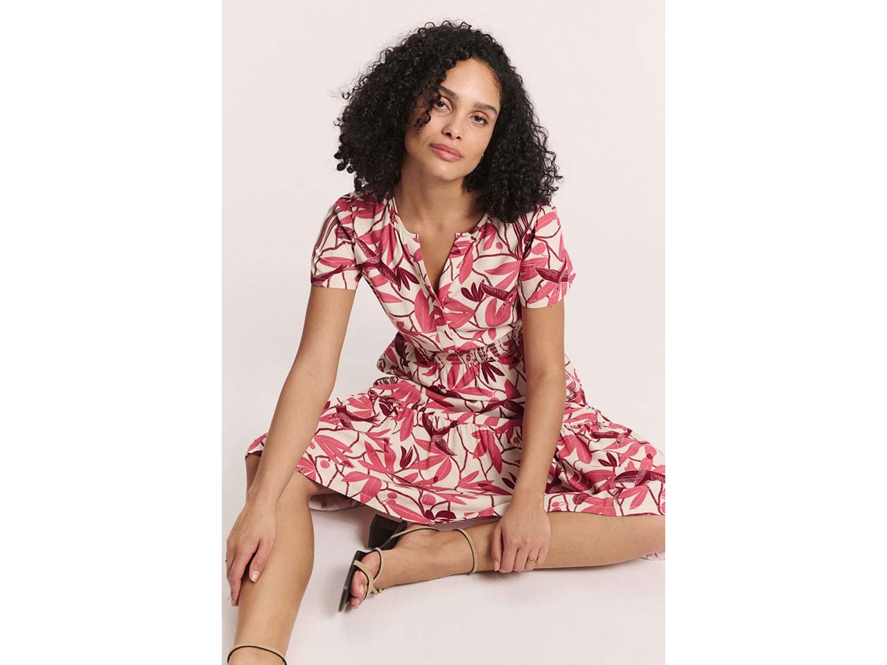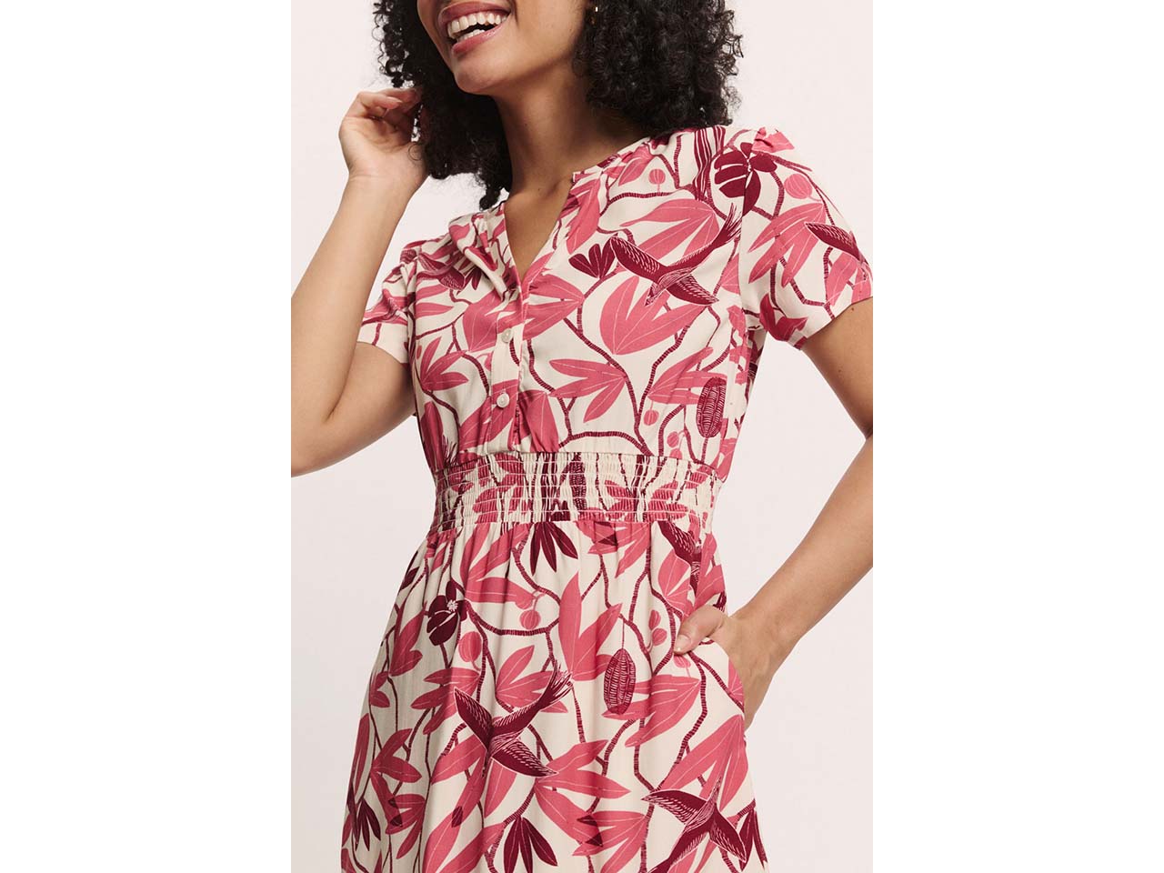 Fühlt sich an wie Sommer und sieht auch so aus! Dieses mittellange Kleid ist perfekt für Freizeit und Alltag in der warmen Jahreszeit. Die seidig-weiche EcoVero™ Viskose sorgt für einen angenehmen Fall und höchsten Tragekomfort. Der V-Ausschnitt, die halbe Knopfleiste und der geraffte Bund sind hübsche Highlights, die das Midikleid zu etwas Besonderem machen. Taschen hat das Kleid auch!