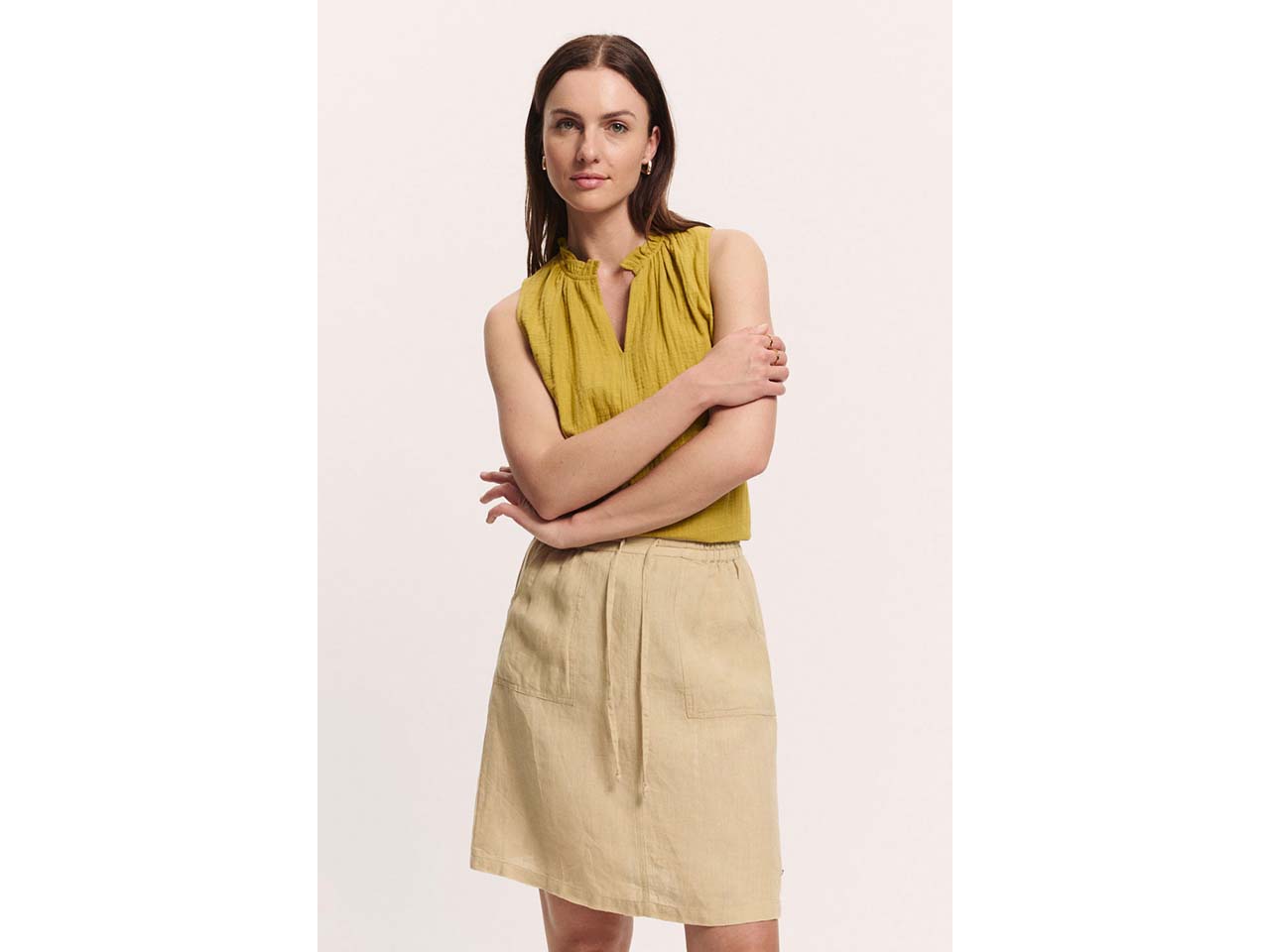 Ein sommerlicher Minirock, der sich vielseitig kombinieren lässt! Dank der Herstellung aus Leinen ist der Rock von tranquillo besonders luftig. Das Bindebändchen am Bund sorgt dafür, dass der Minirock optimal sitzt. Die aufgesetzten Taschen machen ihn perfekt für den Alltag.