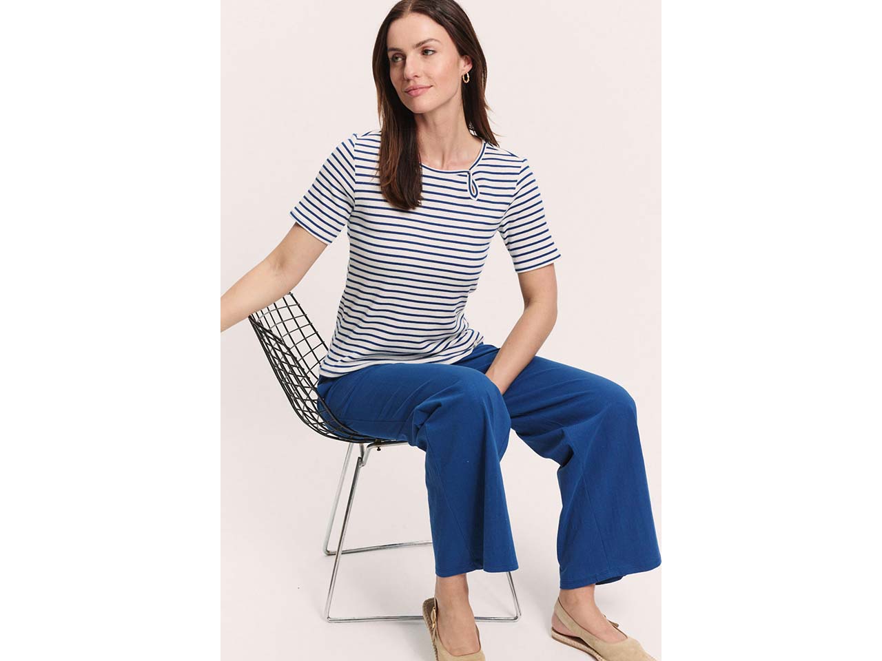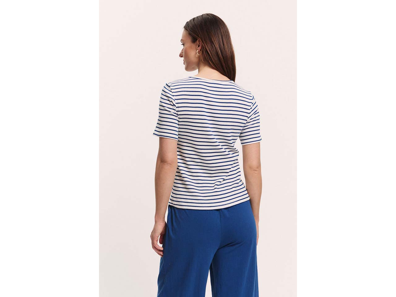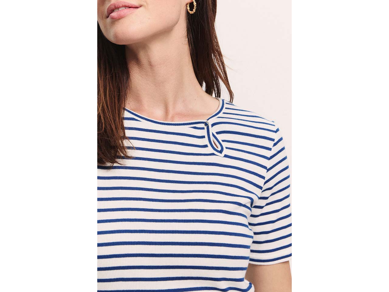 Dieses hübsche T-Shirt in Streifen-Optik sorgt an warmen Tagen für höchsten Tragekomfort! Es besteht aus einem hochwertigen Materialmix mit Tencel™ Modal, Bio-Baumwolle und einem kleinen Anteil Elasthan. Dadurch ist es seidig-weich und macht jede Bewegung mit. Das raffinierte Detail am Rundhalsausschnitt ist ein Hingucker, der das Oberteil besonders macht.