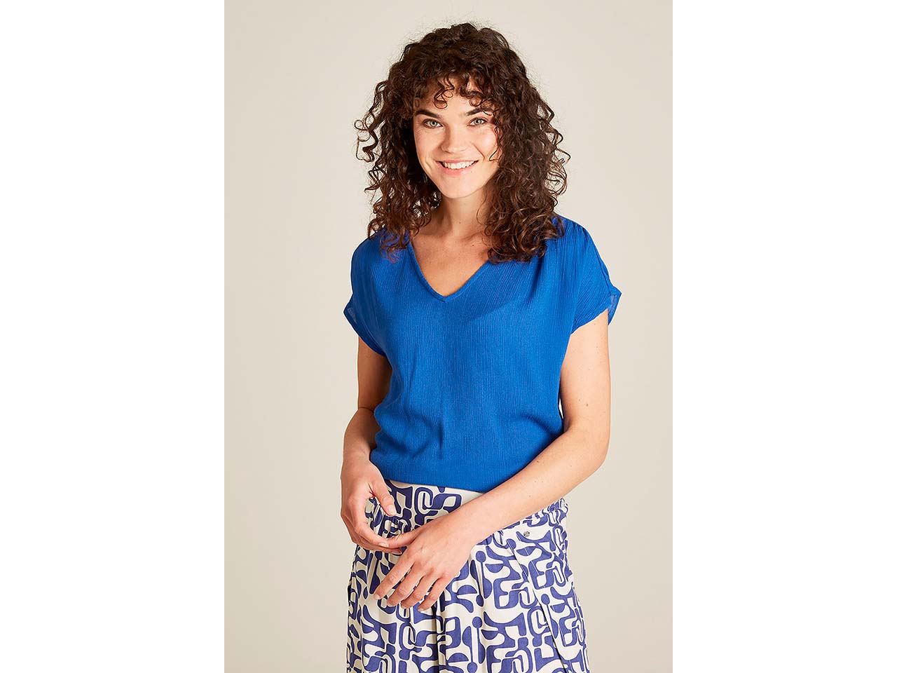 Dieses T-Shirt ist das perfekte Oberteil für einen legeren Style! Die EcoVero™ Viskose fällt elegant und sorgt für einen besonders hohen Tragekomfort. Dezente Raffungen, Details an den Ärmeln und der modische V-Ausschnitt schaffen eine leichte Eleganz, die sich vielseitig kombinieren lässt. Die Shirt-Bluse sitzt locker am Körper und ist ein echtes Must-have für den Kleiderschrank.