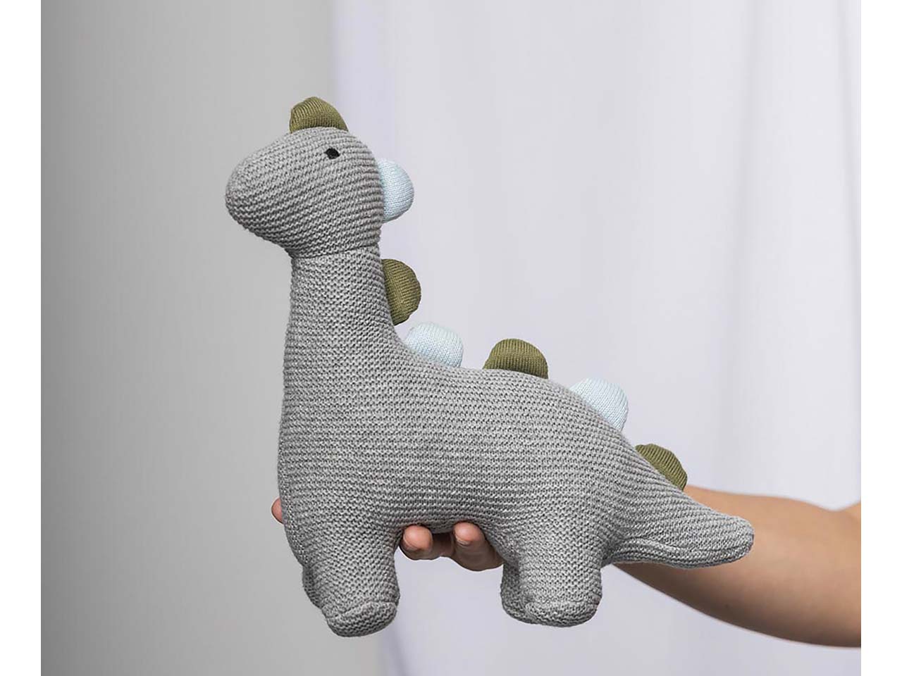Für große und kleine Abenteuerfans ist dieser süße Dino einfach perfekt. Das Kuscheltier ist dank Bio-Baumwolle wunderbar weich und immer bereit, geknuddelt zu werden. Die Füllung besteht aus recyceltem Polyester. Der kleine Dino ist beim Spielen und Toben immer mit dabei, denn das Material ist robust und langlebig. So kann das Kuscheltier Kinder durch die Kindheit begleiten. Am besten wird das Kuscheltier punktuell von Hand gereinigt und nicht in die Waschmaschine gesteckt. B 24 x T 9 x H 30 cm.