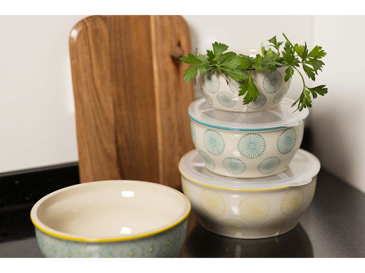 Kompakte Größe, einzigartiges, handgestempeltes Motiv und Platz für die Lieblingssnacks – diese Schüssel darf im Haushalt nicht fehlen! Sie eignet sich gleichermaßen für das Frühstücksmüsli und das Mittag- oder Abendessen. Ganze 400 ml finden hier Platz. Das Beste: Um die Schüssel zu transportieren oder Reste aufzubewahren, verfügt sie über einen praktischen Silikondeckel. Der Inhalt bleibt frisch und nichts verschüttet. So kann die Schale z.B. auch für die Mittagspause mit ins Büro genommen werden. Die Schüssel aus Steinzeug ist ohne Deckel für die Mikrowelle und Spülmaschine geeignet. B 13 x T 13 x H 5,5 cm.