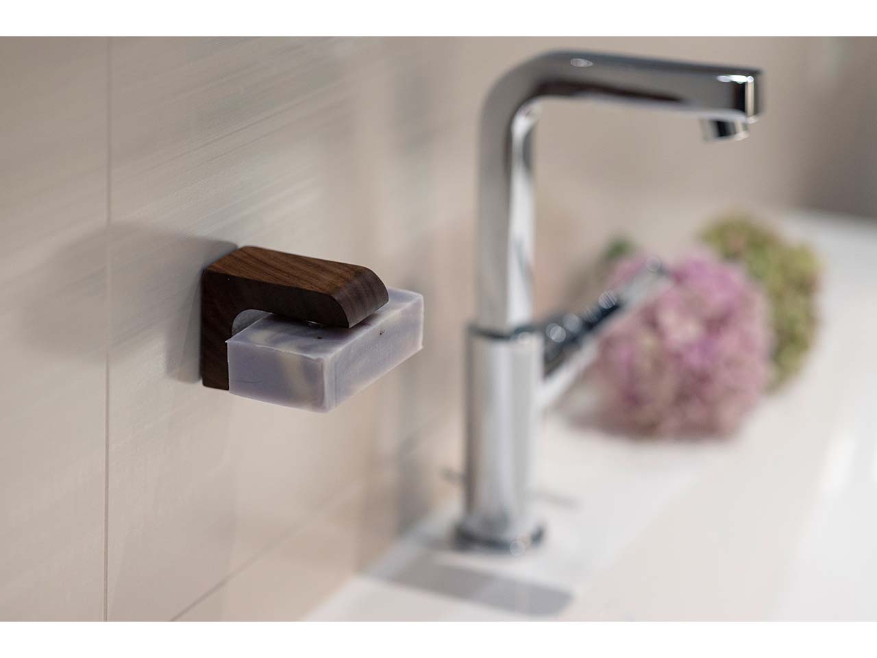 Kein Platz am Waschbeckenrand? Kein Problem! Dieser Seifenhalter wird an der Wand befestigt und hält die Seife mit zwei Magneten fest. Das hat mehrere Vorteile: Die Seife trocknet schneller und hält länger. Der Seifenhalter für Bad oder Gäste-WC ist aus massivem Buchen- oder Walnussholz gefertigt, was dem Accessoire eine schöne, natürliche Optik verleiht. Das minimalistische Design nimmt wenig Platz ein und sieht immer gut aus. 7,8 x 3,3 x 5,4 cm.