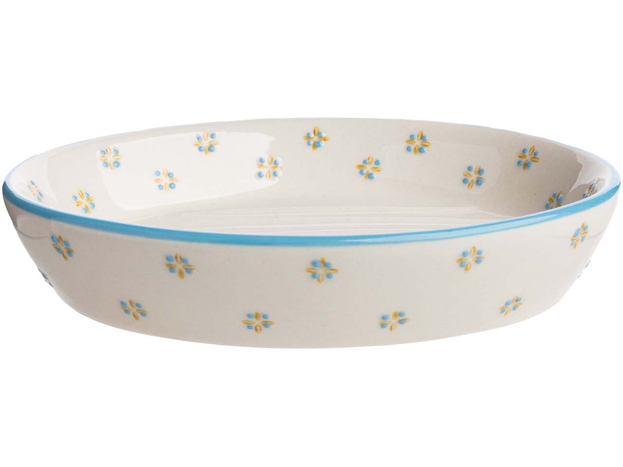 Diese Seifenschale bringt einen Hauch von zurückhaltender Eleganz ins Badezimmer. Durch die Herstellung aus Steingut ist die Schale besonders robust. Highlight ist das wunderschöne, handgestempelte Muster. Die Schale eignet sich nicht nur zur Aufbewahrung von Seife, sondern kann auch als Ablage für Schmuck oder Schlüssel benutzt werden. Ein echter Allrounder für das Zuhause! B 15 x T 11 x H 3 cm.