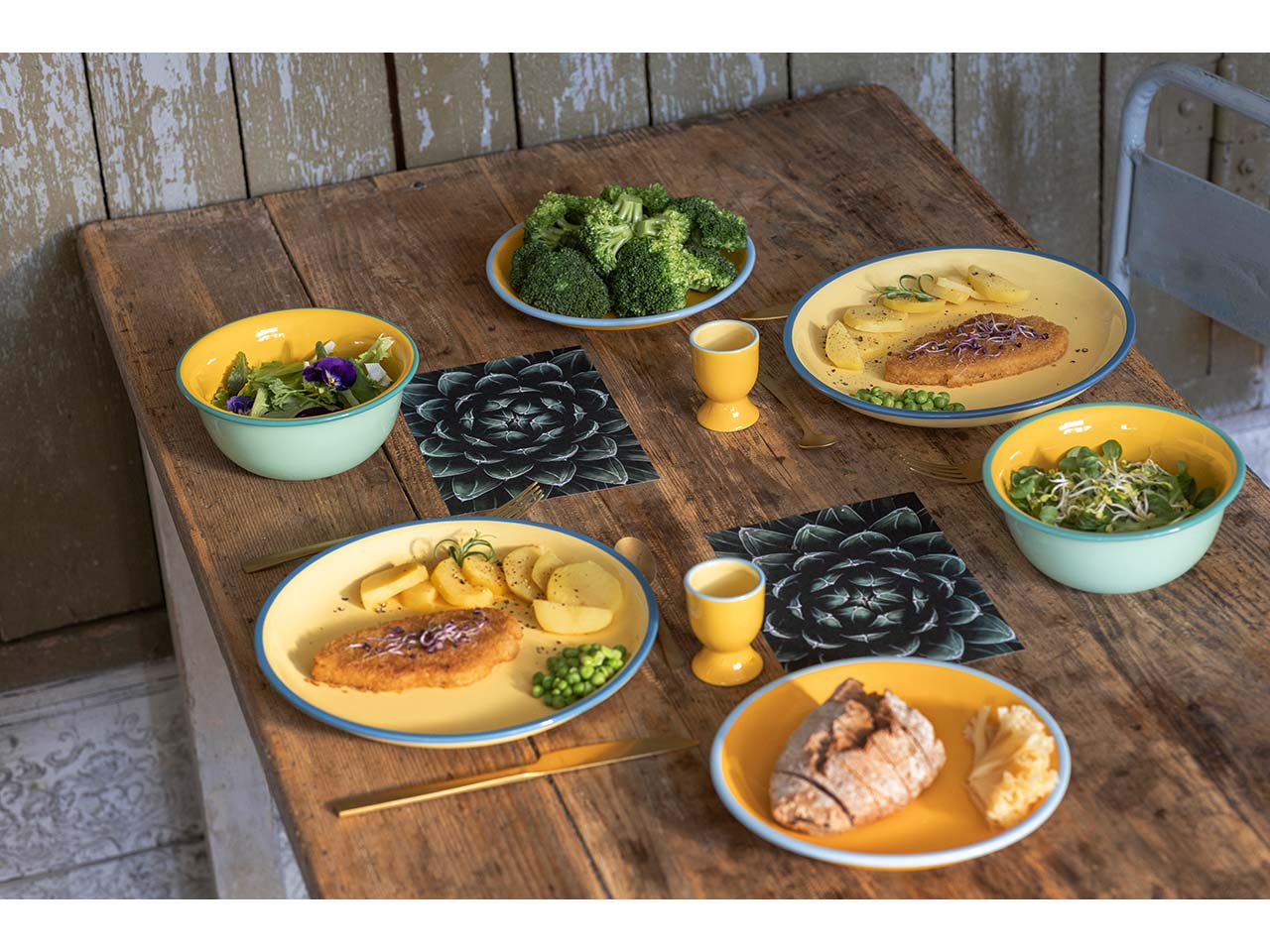 Auf diesem Teller kommt jede Speise wunderbar zur Geltung! Die fröhliche Farbe sorgt bei Frühstück, Abendessen und Co. für beste Laune. Durch die Herstellung aus robustem Steingut ist der Teller langlebig und kann über viele Jahre benutzt werden. Praktisch: Das Geschirr ist mikrowellen- und spülmaschinengeeignet. B 20,5 x T 20,5 x H 2,3 cm.