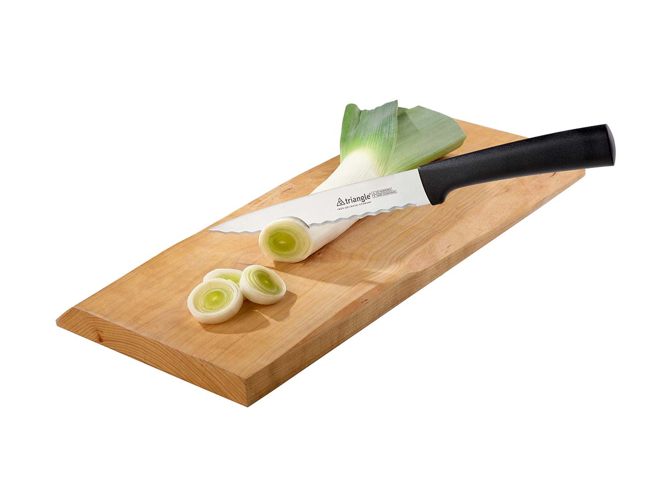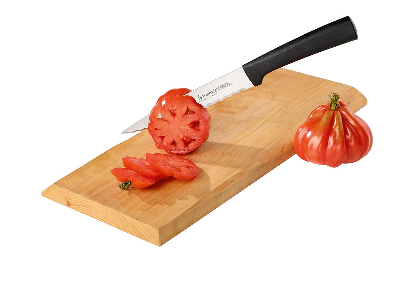 Dauerhaft scharf – so schneidet das Universalmesser von triangle immer zuverlässig. Die Klinge mit Wellenschliff arbeitet besonders effektiv beim Zerteilen von weichen, druckempfindlichen Lebensmitteln. Ohne unnötigen Druck werden Tomate, Füllungen und Gegartes ganz einfach und sauber zerteilt. Die in Solingen traditionell handgefertigte Klinge aus rostfreiem Spezialstahl verspricht höchste Qualität und anhaltende Schärfe. Bei Bedarf lässt sich die Schneide auch problemlos nachschärfen. Der biobasierte Kunststoffgriff ist besonders hygienisch und lebensmittelecht durch eine fugenlose Verarbeitung. Durch eine exakte Abstimmung von Klinge und Griff liegt das universell einsetzbare Messer besonders gut in der Hand. Spülmaschinen geeignet, Handreinigung empfohlen. Länge 16cm.