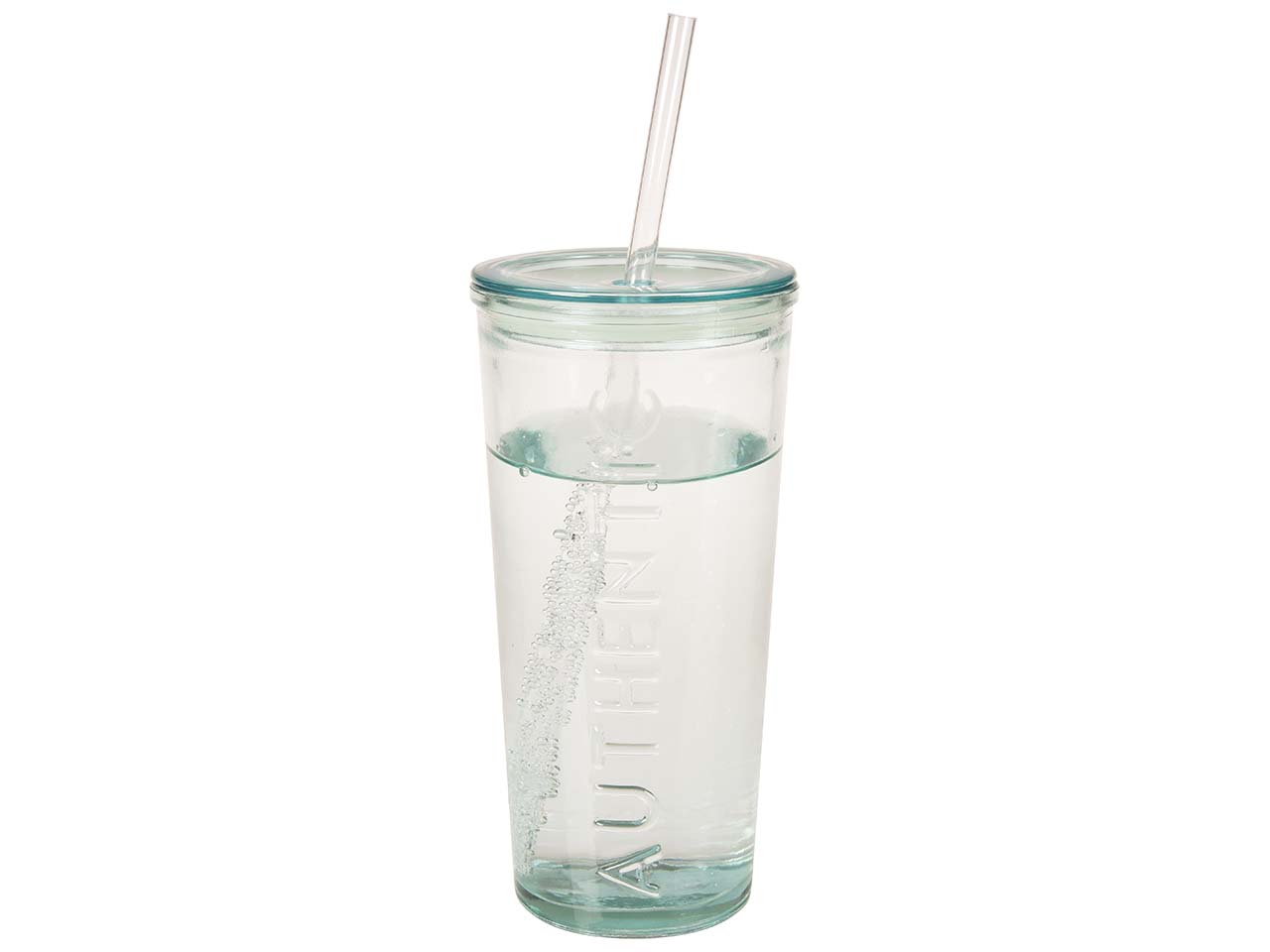 Schönes, dickes Glas, toll für unterwegs. Der Kunststoffstrohalm ist ok.