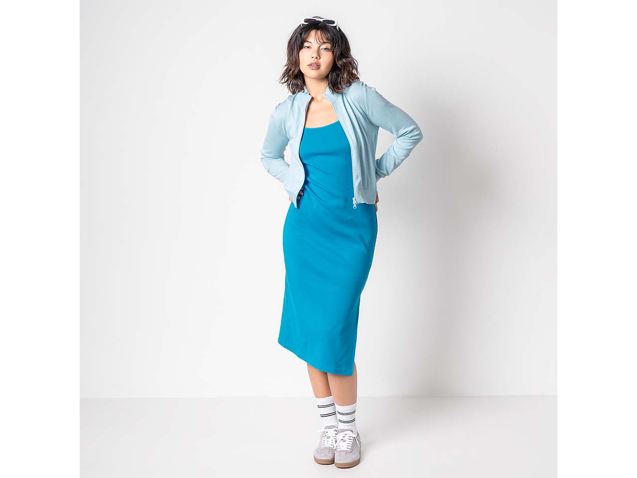 Nachhaltiger Style mit Coolness-Faktor! Das Slim-Fit-Kleid schmiegt sich dank GOTS-zertifizierter Bio-Baumwolle weich an den Körper an und macht jede Bewegung mit. Modische Akzente setzt der elegante Schlitz an der Seitennaht. Die Träger sind verstellbar und lassen sich binden. Damit entsteht ein ganz eigener Look! Das Midi-Kleid ist perfekt für die nächste Sommerparty.