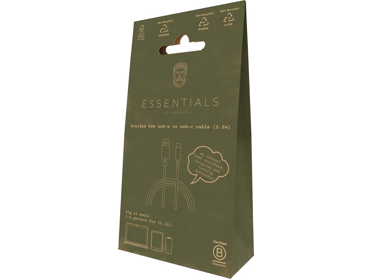 Das USB-A-zu-USB-C-Ladekabel ist ein unverzichtbares Zubehör für Smartphone, Tablet und andere Geräte. Bei der Entwicklung wurde besonderer Wert auf Umweltverträglichkeit und Kreislaufwirtschaft gelegt, weswegen recyceltes PET und TPE zum Einsatz kommen. So werden Abfall eingespart und Ressourcen geschont. Es überzeugt durch eine robuste Verarbeitung und hält problemlos bis zu 30.000 Biegungen stand. Das Ladekabel ist in den Längen 1,2 m und 2,5 m erhältlich und wird in einer plastikfreien Verpackung aus recyceltem Kraftpapier geliefert.