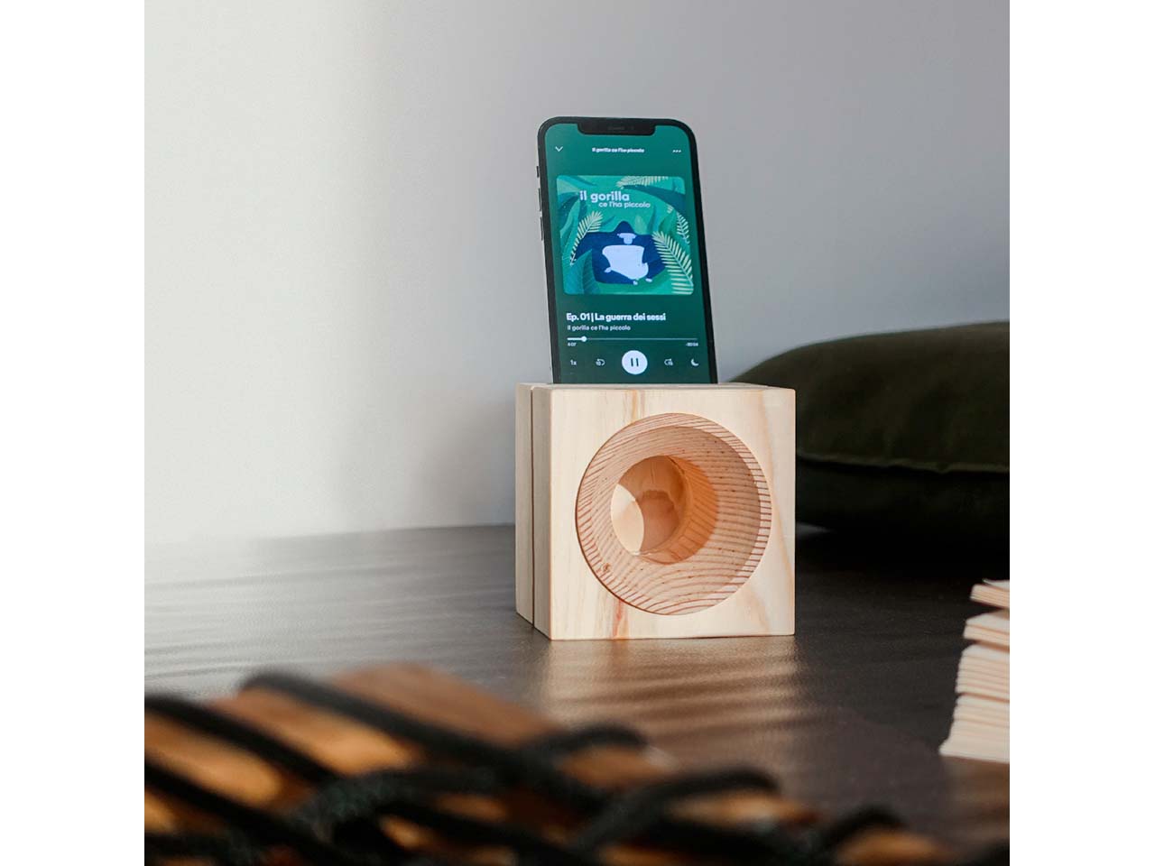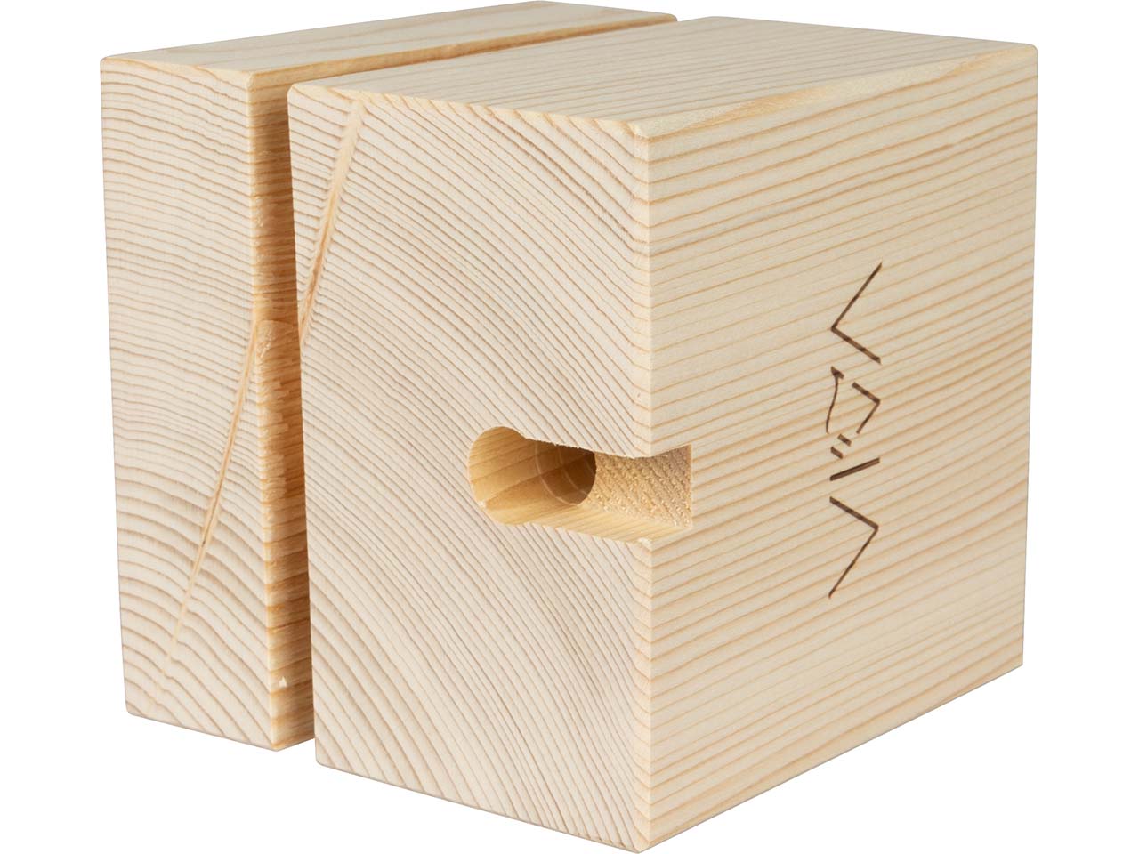 Ein Stück Wald wird wiedergeboren: 2018 verursachte das Sturmtief Vaia viele Schäden. Bäume knickten teilweise um wie Streichhölzer. Genau diese Bäume erhalten in Form dieses einzigartigen Würfels nun ein neues Leben. Jeder akustische Verstärker besteht aus jenen Bäumen, die vom Sturm gefällt wurden. Jeder ist ein Unikat. Die Axtschläge folgen den natürlichen Maserungen des Holzes und erzählen so eine Geschichte. Der kleine Würfel-Lautsprecher sieht aber nicht nur schick aus, sondern hilft auch dabei, den Wald zu regenerieren: Für jeden verkauften Würfel wird in den Dolomiten ein neuer Baum gepflanzt. Akustisch begeistert der Lautsprecher für Smartphones mit spontaner Verstärkung von Fichten- und Lärchenholz. Vor allem Fichte wird auch gerne für den Geigenbau benutzt, da es für seinen besonders warmen Klang bekannt ist. Ideal für alle, die Musik lieben und gleichzeitig etwas Gutes für die Umwelt tun wollen! B 100 x T 100 x H 100 mm.