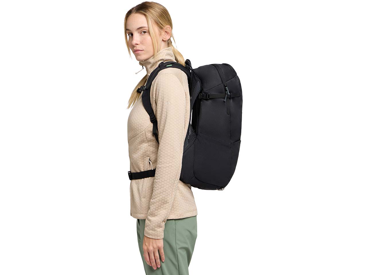 Dieser vielseitige Wander- und Alltagsrucksack ist nicht nur kompakt designt, sondern speziell für Frauen und kleinere Personen konzipiert! So gewährleisten die Schultergurte optimale Bewegungsfreiheit. Die 22 l Volumen bieten viel Platz für alles Wichtige wie Kleidung und Verpflegung. Highlights sind das Kartenfach, die Stockhalterung und die Brillenfixierung am Schultergurt. Die 2-Stretch-Seitentaschen eignen sich unter anderem für Trinkflaschen. Über einen Ausgang für ein Trinksystem verfügt der Rucksack ebenso. Mit Brustgurt und Gurtband-Hüftgurt entsteht ein hoher Tragekomfort. Der Daypack mit Hauptmaterial aus recyceltem Polyester kommt mit Regenhülle, die sogar als Tasche nutzbar ist!
