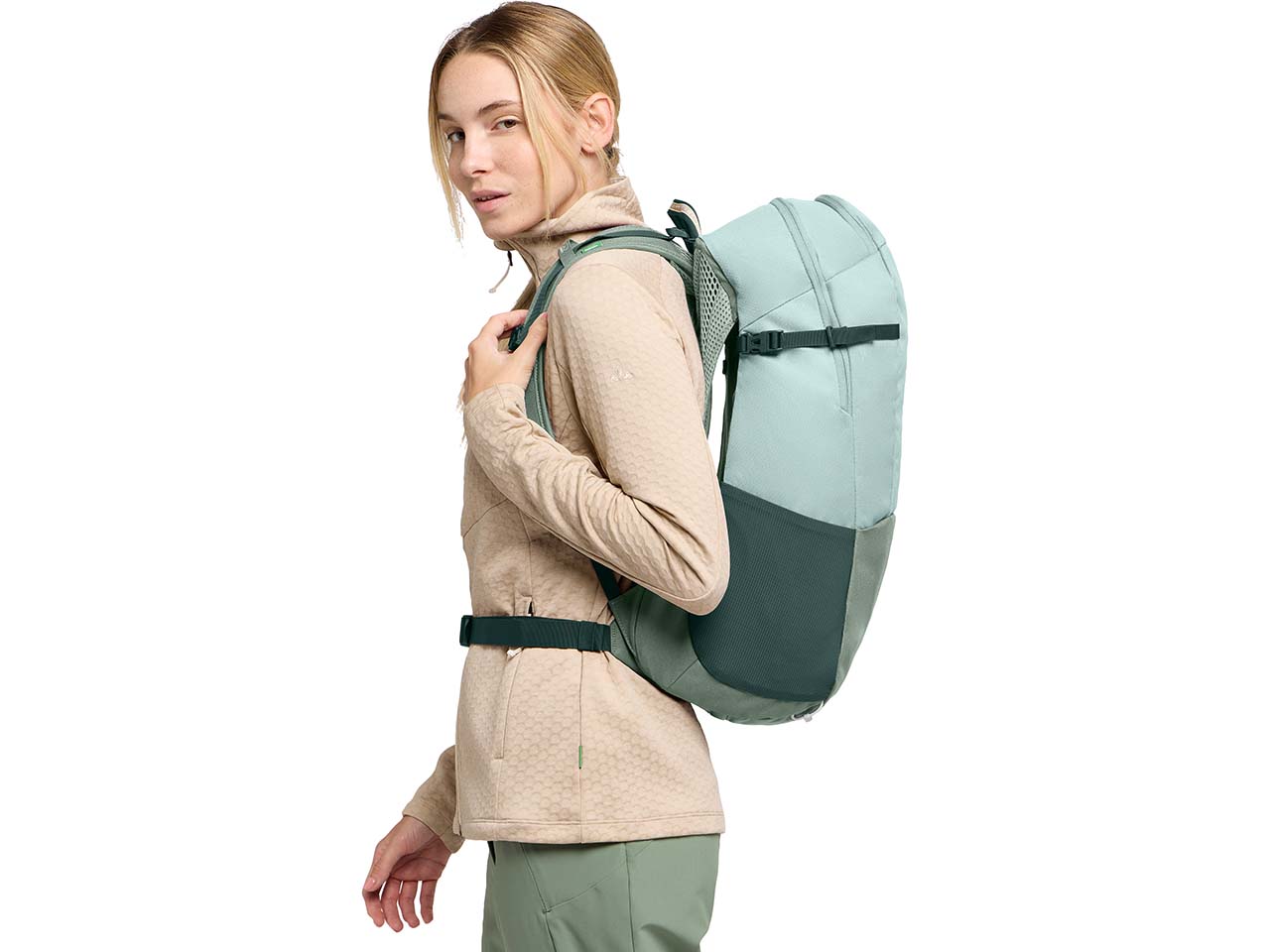 Dieser vielseitige Wander- und Alltagsrucksack ist nicht nur kompakt designt, sondern speziell für Frauen und kleinere Personen konzipiert! So gewährleisten die Schultergurte optimale Bewegungsfreiheit. Die 22 l Volumen bieten viel Platz für alles Wichtige wie Kleidung und Verpflegung. Highlights sind das Kartenfach, die Stockhalterung und die Brillenfixierung am Schultergurt. Die 2-Stretch-Seitentaschen eignen sich unter anderem für Trinkflaschen. Über einen Ausgang für ein Trinksystem verfügt der Rucksack ebenso. Mit Brustgurt und Gurtband-Hüftgurt entsteht ein hoher Tragekomfort. Der Daypack mit Hauptmaterial aus recyceltem Polyester kommt mit Regenhülle, die sogar als Tasche nutzbar ist!