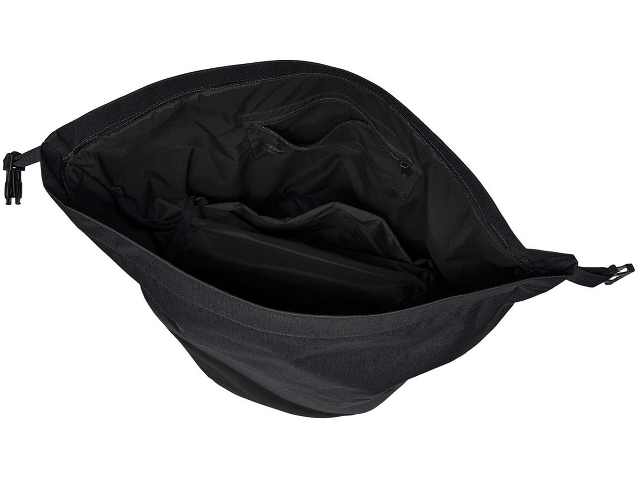 Diese Doppel-Fahrradtasche wird einfach auf den Gepäckträger aufgelegt – einfacher und praktischer geht es wirklich nicht! Fahrradfahrende werden die großzügige Tasche aus recyceltem Material sofort lieben, denn sie bietet viel Platz für alles Wichtige. Die große Öffnung vereinfacht Ein- und Auspacken und gibt einen Überblick über den Inhalt der Tasche. Durch das hohe Packmaß passen selbst größere, sperrige Dinge in die Tasche wie z.B. Posterrollen. Das ganze Volumen wird nicht benötigt? Auch das ist kein Problem, denn der obere Bereich lässt sich rollen und mit einem Klickverschluss verschließen. Die einzelnen Taschen können über Druckknöpfe ebenfalls verknüpft werden. Ist man in der Stadt unterwegs zum Einkaufen, etc. lässt sich die Tasche wie ein Shopper tragen. In dem Wertsachenfach sind Geldbeutel, Schlüssel und Smartphone zu jedem Zeitpunkt sicher aufgehoben. Das Material ist mit Eco Finish imprägniert und die mitgelieferte Regenhülle schützt vor stärkerem Regen. Mit 32 + 6 l Volumen. B 60 x T 9 x H 24 cm.