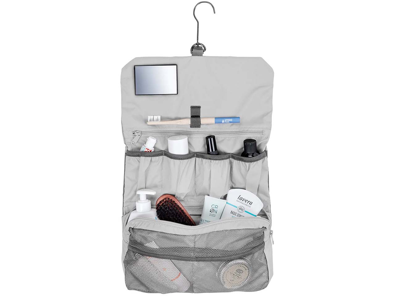 Dieser Kulturbeutel ist der perfekte Begleiter für große Reisen und kurze Ausflüge! Hergestellt aus recyceltem Polyester ist das Material schnelltrocknend und strapazierfähig. Der Kulturbeutel mit durchdachter Innenaufteilung hält also einiges aus. Mit Spiegel, Zahnbürstenhalter und praktischem Haken zum Aufhängen ist alles dabei, was gebracht wird. Zwei Reißverschlussfächer stehen ebenfalls zur Verfügung. Die zahlreichen Steckunterteilungen ermöglichen eine ordentliche Aufbewahrung. Der Waschbeutel hat ein Volumen von 2 l.
