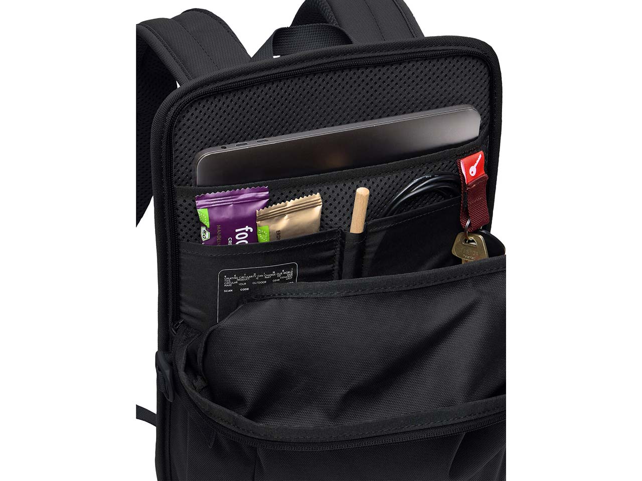 | Fächer: | übersichtliches Hauptfach, gepolstertes Tabletfach, aufgesetzte Fronttasche, Schlüsselhalter |