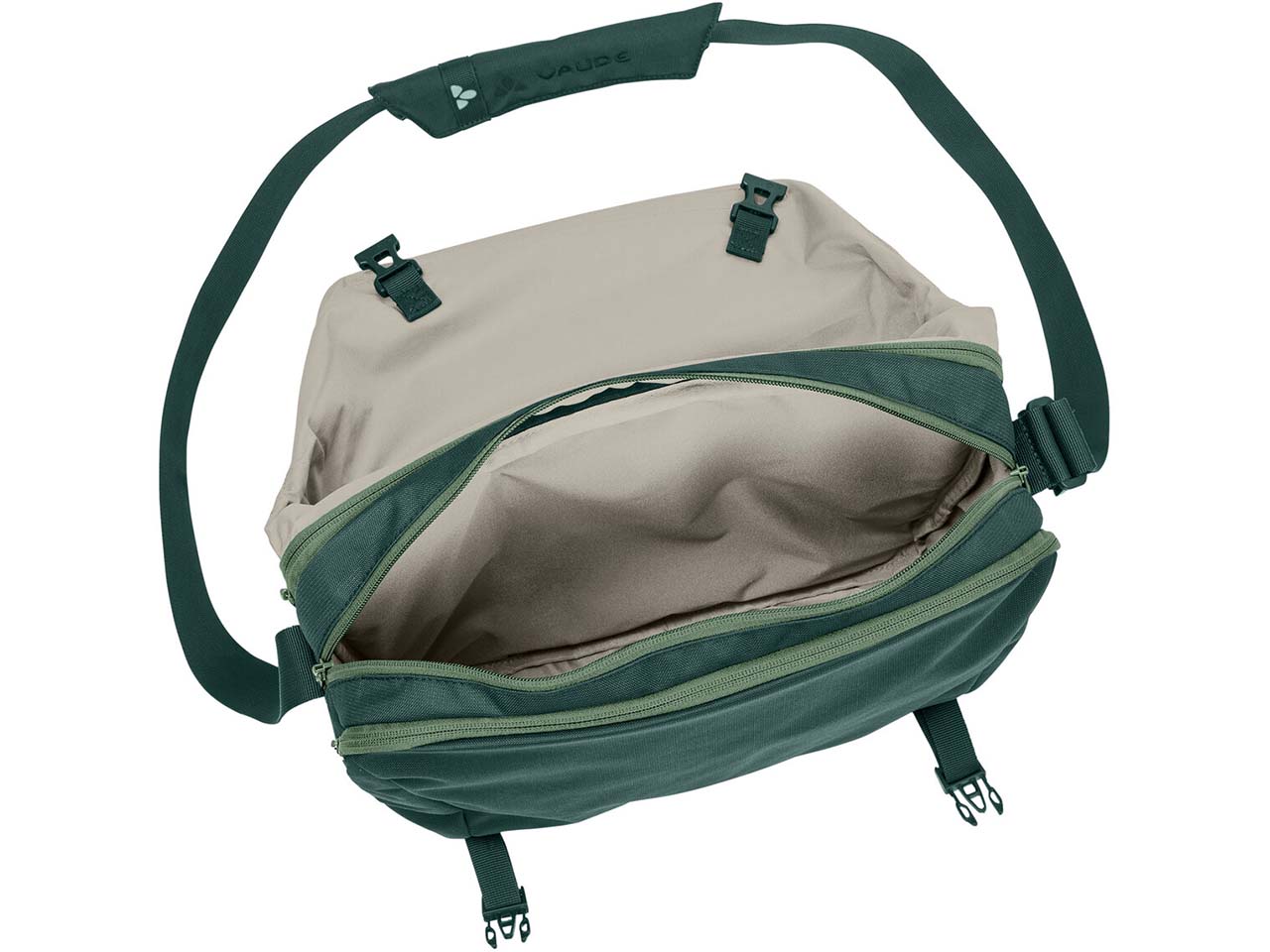 Die stylische, praktische Umhängetasche von VAUDE passt perfekt in den urbanen Alltag. Ob auf dem Weg zur Arbeit, zur Uni oder zum Sport, die Tasche bietet mit ihrer durchdachten Innenaufteilung und mehreren Fächern Platz für alles Wichtige. Der Organizer in der Front-Außentasche, die Handytasche sowie Schlüssel- und Stiftehalter sorgen für Ordnung im Inneren. Ein Notebookfach für Geräte bis 13,3“ hat die Umhängetasche mit gepolstertem Boden ebenfalls. Der Schulterriemen hat ein Komfortschulterpolster. Das Volumen der Tasche aus recycelten PET-Flaschen beträgt 13 l.
