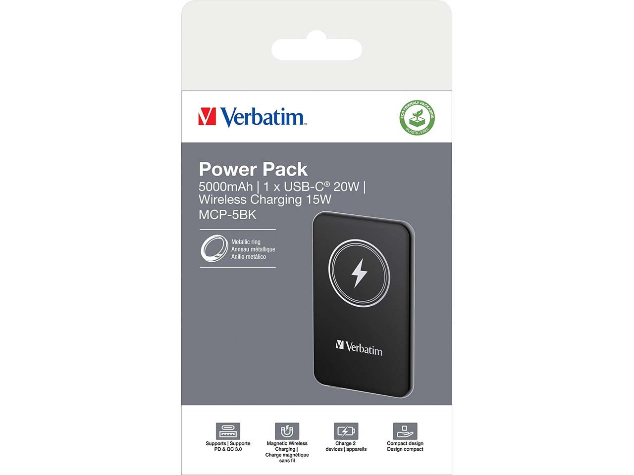 | Lieferumfang: | Verbatim Powerbank "Magnetic Wireless", 30 cm USB-C auf USB-C Kabel, Metallring, Quick Start Guide |