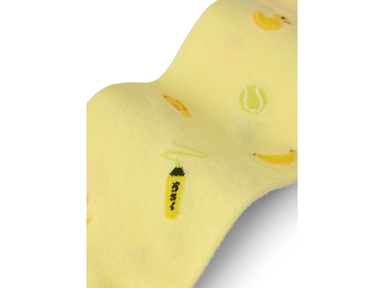 Quietschend gelbe Socken für gute Laune! Banane, Tennisball und Entchen sorgen dafür, dass man den Morgen mit einem Lächeln beginnen kann. Dabei überzeugen die GOTS-zertifizierten Bio-Socken auch mit hohem Tragekomfort. Der hochwertige Bio-Baumwoll-Materialmix ist atmungsaktiv, temperaturregulierend und liegt weich auf der Haut. Das Motiv ist mit 200-Nadel-Strickung auf den Socken eingestrickt. Ferse und Spitze sind für eine langlebige Qualität verstärkt.
