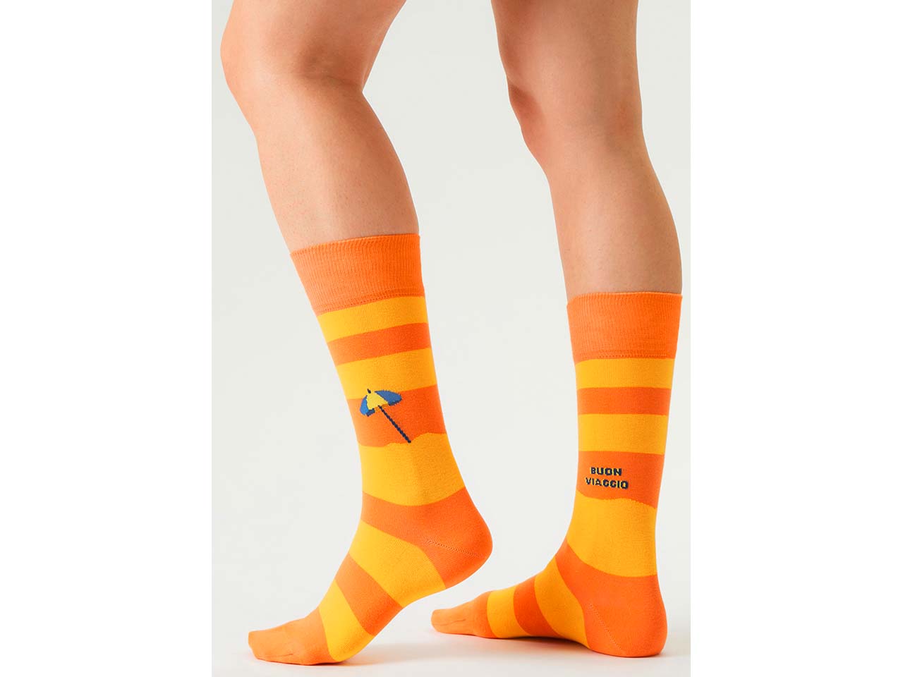 Sommer, Strand und gute Laune – genau dieses Gefühl vermitteln diese orangen gestreiften Socken in GOTS-zertifizierter Qualität! Der italienische Schriftzug und der kleine Sonnenschirm machen Lust auf Urlaub. Perfekt, um das Freizeitoutfit zu akzentuieren. Dabei fühlen sich die Socken auch immer bequem am Fuß an. Der hochwertige Materialmix besteht aus Bio-Baumwolle, recyceltem Polyamid und einem kleinen Anteil Elasthan. Dadurch entsteht eine atmungsaktive Qualität.