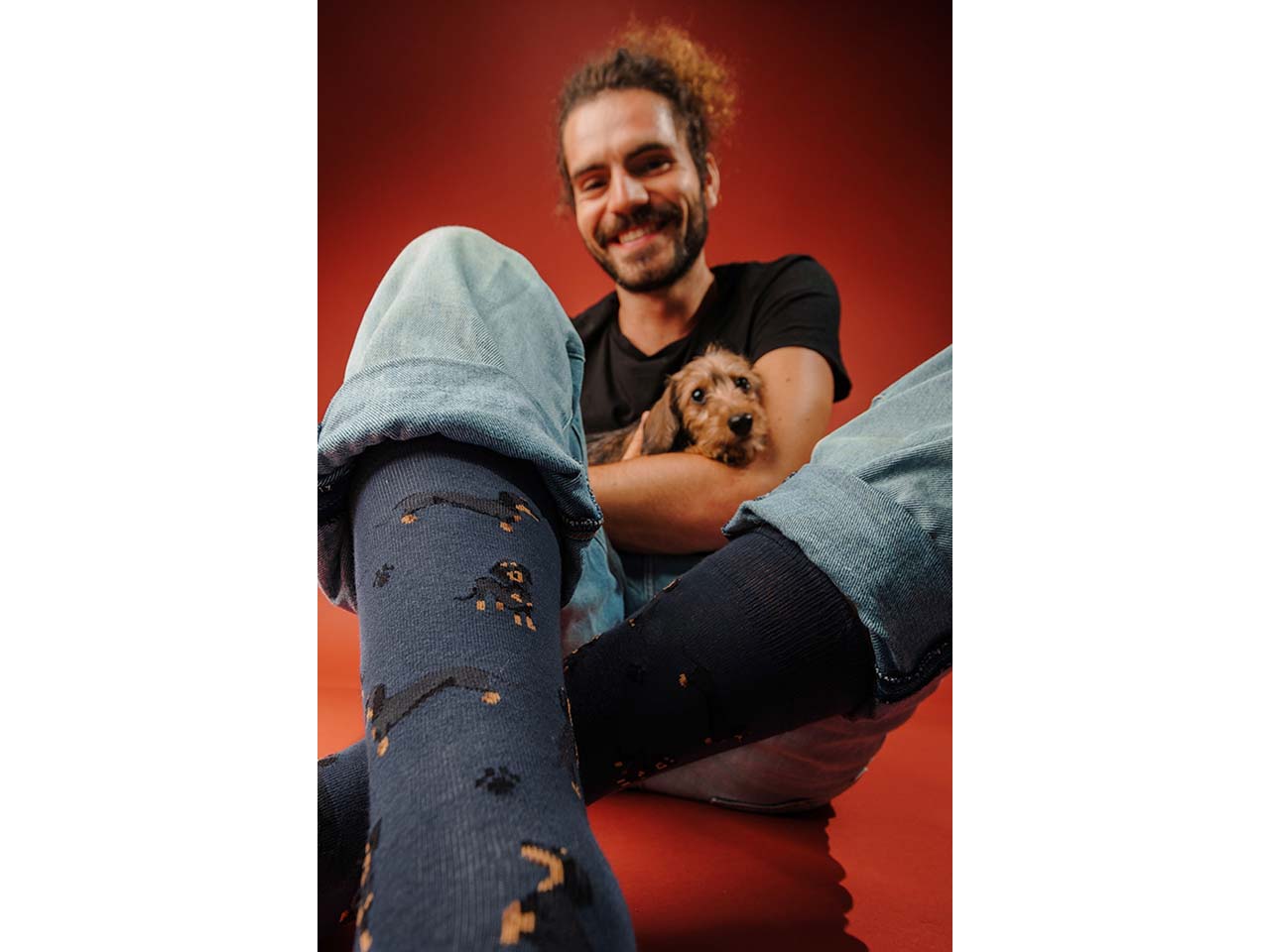 Mit 200 Nadeln gestrickte Socken mit Dackel-Motiv