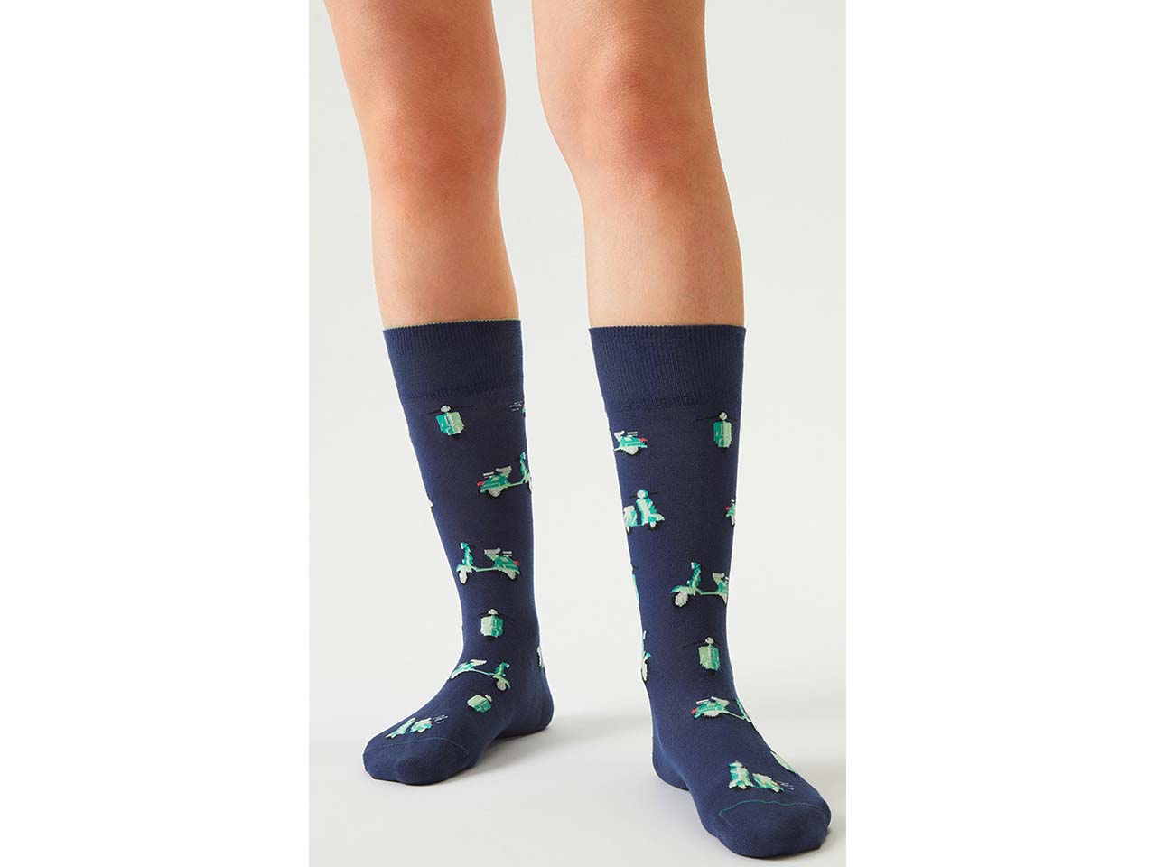 Die perfekten Socken für alle, die gerne und viel unterwegs sind! Das Motiv mit den Motorrollern, die über den dunkelblauen Untergrund fahren, sieht richtig cool aus und passt zu Freizeitoutfits. Durch den Materialmix mit Bio-Baumwolle, Polyamid und einem geringen Anteil Elasthan sitzen die Socken optimal am Fuß und sorgen für einen atmungsaktiven Tragekomfort.