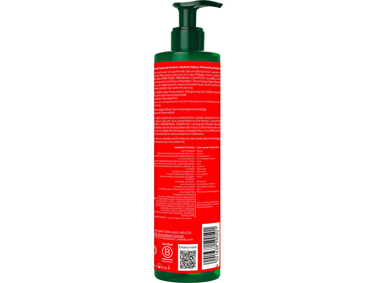 Für samtig glatte Haut sorgt diese hochwertige, NATRUE-zertifizierte Körperlotion von WELEDA. Der Peptide + Renewal Complex aus Bio-Granatapfelsamenöl und Maca-Peptiden festigt und regeneriert die Haut und regt die Zellerneuerung an. Die Haut erhält mehr Elastizität und wird vor freien Radikalen geschützt, sodass vorzeitiger Hautalterung vorgebeugt wird. Ein sinnlicher Duft verwöhnt die Sinne bei der täglichen Pflege.