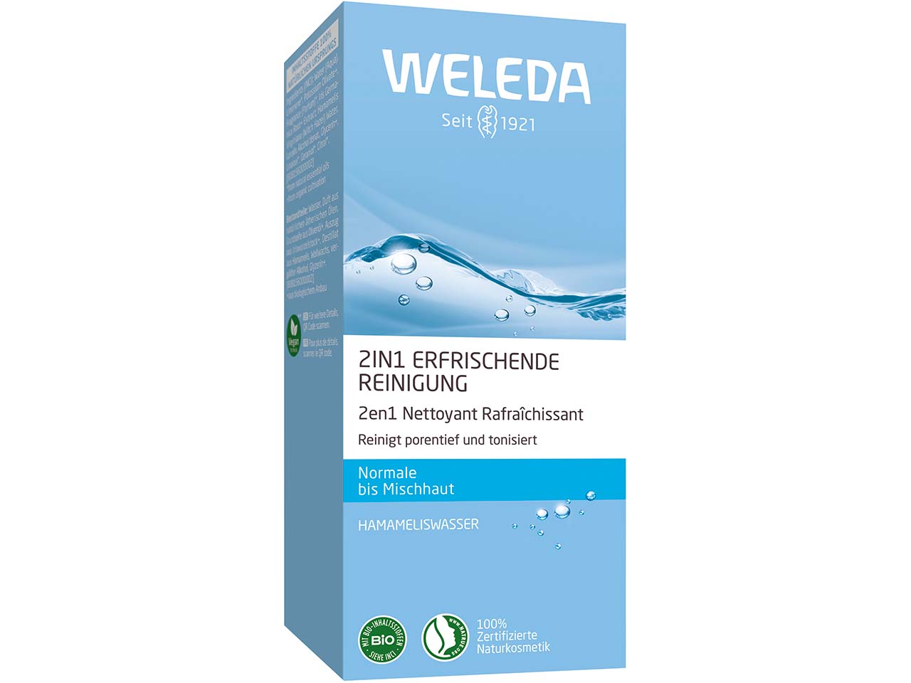 Porentiefe Reinigung und ein verfeinertes Hautbild: Die erfrischende 2-in-1 Reinigung von Weleda macht es möglich! Die leichte, milchige Lotion in NATRUE-zertifizierter Qualität enthält natürliche Olivenölseife und Hamamelisextrakt. Durch die Anwendung wird die Haut porentief gereinigt und das Hautbild wirkt rein und frisch. So ist die Haut ideal auf die Pflege vorbereitet. Dazu gesellt sich ein zitronig-frischer Duft aus ätherischen Ölen, der die Sinne belebt und für gute Laune sorgt. Das Pflegeprodukt eignet sich für normale bis Mischhaut und auch zum Entfernen von Make-up. Anwendung: Morgens und abends auf ein Wattepad geben und dann Gesicht, Hals und Dekolleté sanft abreiben. Inhalt 100 ml.