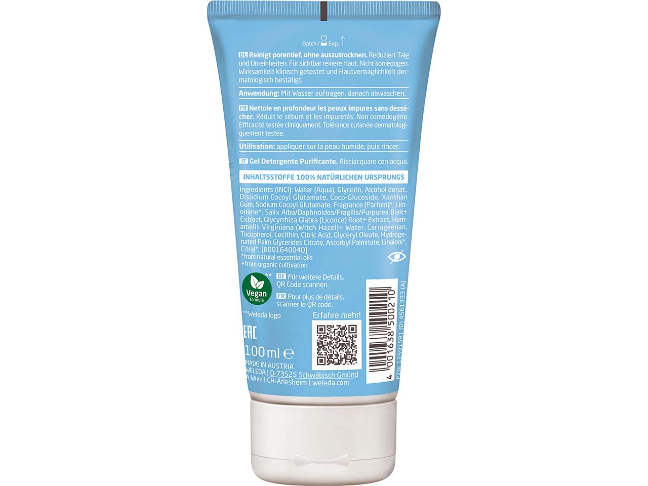 Das Waschgel von Weleda ist perfekt, um unreine Haut porentief zu reinigen. Antibakterielle Wirkstoffe aus Weidenrindenextrakt und Hamamelis tragen dazu bei, dass ein reines Hautbild entsteht, ohne dass die Haut austrocknet. Überschüssiger Talg wird durch die Anwendung reduziert und Hautunreinheiten so effektiv vorgebeugt. Die Haut wird beruhigt und Pickel sowie Mitesser reduziert. Der angenehme Duft entsteht durch ausgewählte ätherische Öle, die traditionell in der Behandlung von Hautproblemen eingesetzt werden. Anwendung: Das Waschgel morgens und abends mit kreisenden Bewegungen sanft auf dem feuchten Gesicht aufbringen und dann abspülen. Inhalt 100 ml.